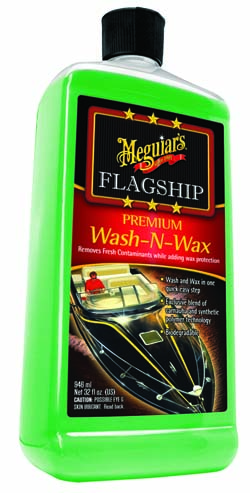 Meguiars Flagship Premium Wash N Wax uses an exclusive blend of carnauba and synthetic polymers to add a valuable layer of wax protection while at the same time delivering great cleaning results. This advanced belnd not only emulsifies sald spray, dirt, bird dropppings, and boat scum but also protects against salt air corrosion and the sun's ultraviolet rays while adding a brilliant streak free shine. Ideal fro those hard to work areas like non-skid, no extra rubbing required.