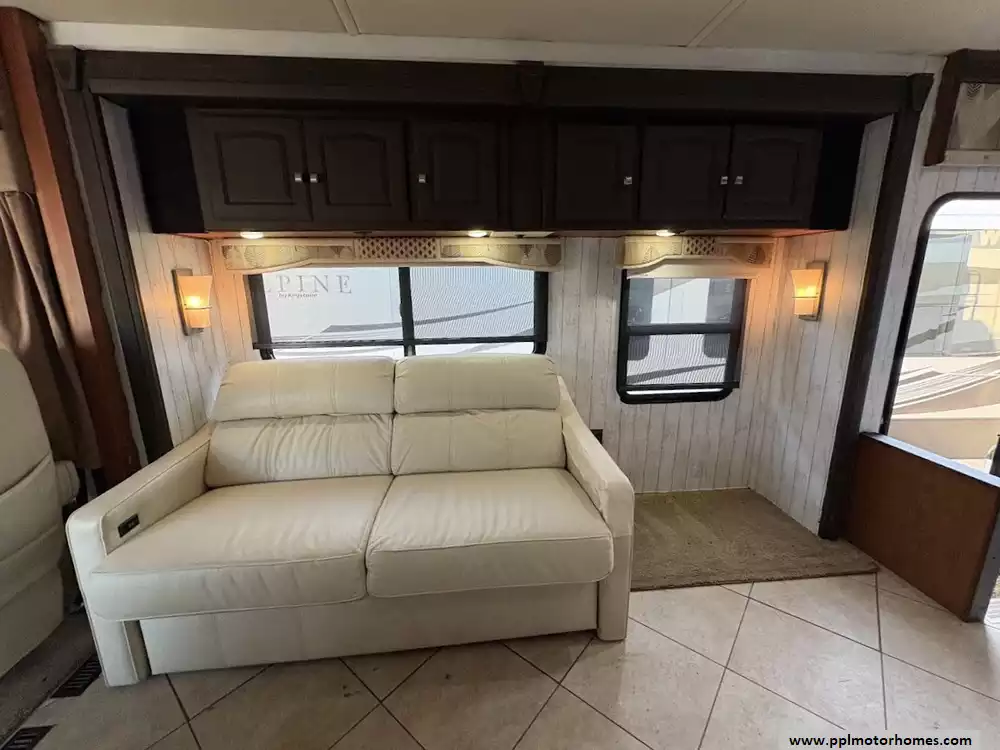 This 2013 Winnebago Adventurer 37F sleeps up to 4 people, has a Triton V10 Ford Engine On a Ford 350 Chassis, 3 Slide-outs, Onan Gas Generator, 2 Ducted Air Conditioners, Levelers, 4 Door Gas/110v Norcold Refrigerator, In-Fridge Ice Maker, Automatic Main Awning, Washer/Dryer, Backup Camera, Satellite Dish, 2 TVs, Convection Microwave, 3 Burner Range, Oven