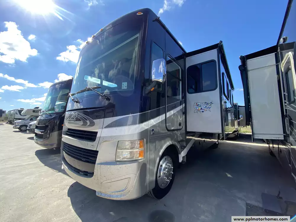 This 2016 Allegro Open Road 32A has a V-10 6.8l Ford Engine On a Ford Chassis, 2 Slide-outs, Onan Gas Generator, 2 Ducted Air Conditioners, Levelers, Double Door 12v Residential Lg Refrigerator, In-Fridge Ice Maker, Automatic Main Awning, Backup Camera, Satellite Dish, Outside Entertainment System, 3 TVs, Outside Shower, Fireplace, Central Vacuum, Convection Microwave, 3 Burner Range
