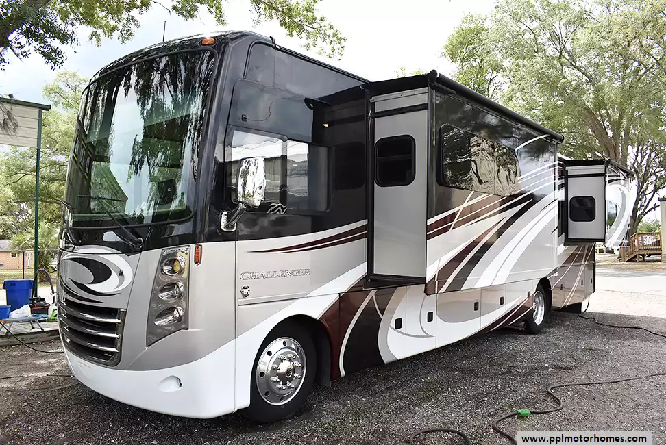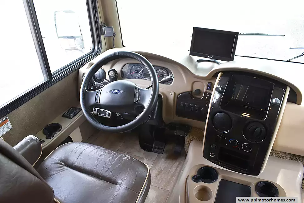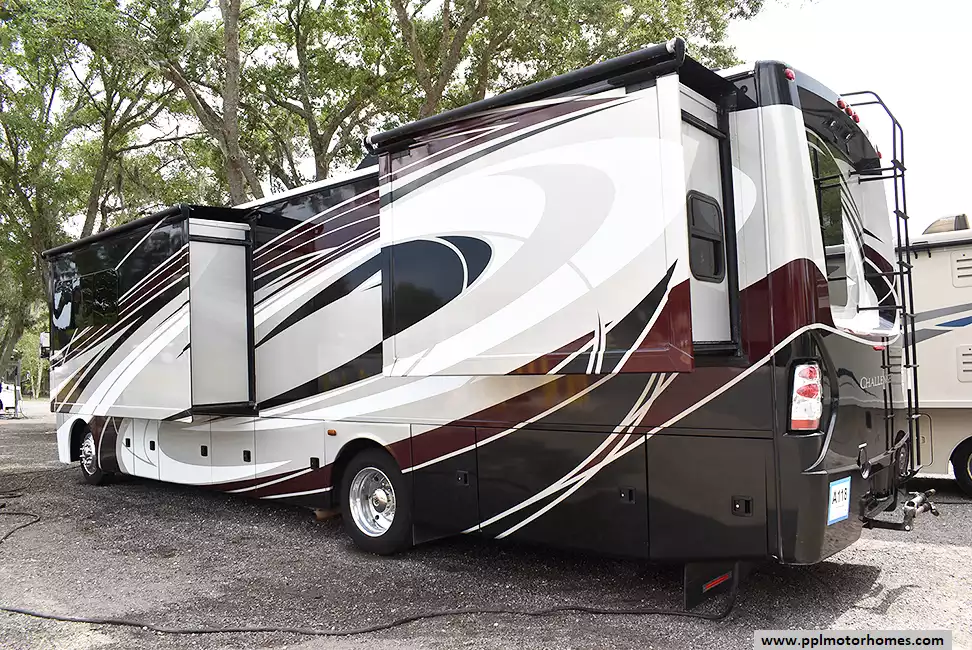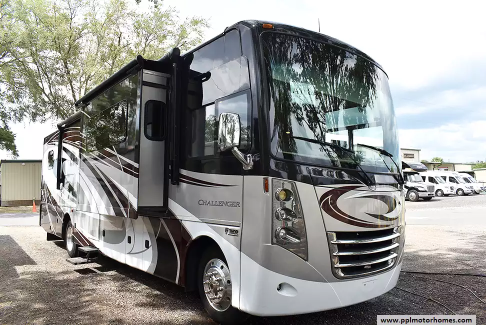 This 2017 Thor Challenger 36T has a V10 Ford Engine On a Ford Chassis, Air Bag Suspension, 3 Slide-outs, Onan Gas Generator, 2 Ducted Air Conditioners, Levelers, Double Door Gas/110v Whirlpool Refrigerator (Additional Refrigerator Present), In-Fridge Ice Maker, Automatic Main Awning And Slide Awning, Backup Camera, GPS System, Satellite Receiver, Outside Entertainment System, 3 TVs, Outdoor Grill, Outside Shower, Fireplace, Convection Microwave, 3 Burner Range