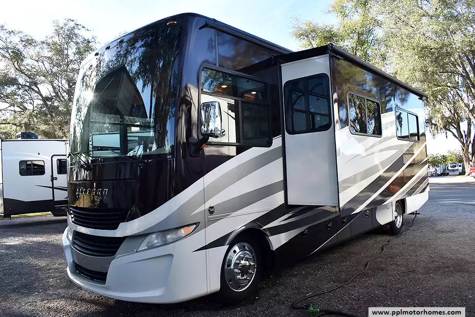 This 2017 Allegro Open Road 32SA has a V10 Ford Engine On a Ford Chassis, 2 Slide-outs, Onan Gas Generator, 2 Ducted Air Conditioners, Levelers, Double Door Residential Maytag Refrigerator, Automatic Main Awning And Slide Awning, Backup Camera, Satellite Dish & Receiver, Outside Entertainment System, 4 TVs, Outside Shower, Fireplace, Microwave, 3 Burner Range, Oven