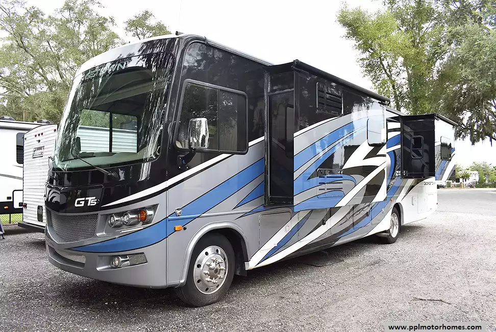 This 2020 Georgetown Gt5 34H has a Ford Engine On a Ford Chassis, 3 Slide-outs, Onan Gas Generator, 2 Ducted Air Conditioners, Levelers, 4 Door Gas/12v Norcold Refrigerator, Automatic Main Awning, Washer/Dryer, Backup Camera, GPS System, Outside Entertainment System, 3 TVs, DVD Player, Outside Shower, Fireplace, Convection Microwave, 3 Burner Range, Oven