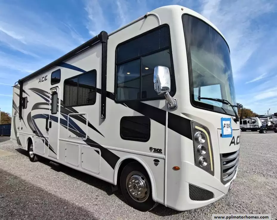 The 2023 Thor A.C.E. 30C is a gas-powered Class A motorhome built on a Ford F-53 chassis - extremely well cared for. It is known for its practical, family-friendly floorplan that features two slide-outs, a rear king-size bed, a leatherette jack-knife sofa, a Dream Dinette booth that converts to a bed. and a drop-down bunk over the cab. It is equipped for both indoor and outdoor living, with an exterior kitchen and entertainment center. The A.C.E. is equipped with a 10-in touchscreen dash radio that is Bluetooth, Android AutoT, and Apple CarPlayr ready. It is also equipped with a comprehensive camera system that includes a back-up camera and integrated side-view cameras. Features a GE double-door refrigerator, a three-burner gas cooktop and oven with a glass cover, a microwave, a double-bowl stainless steel sink, and solid-surface countertops.The unit comes with automatic leveling jacks with touchpad controls and enclosed and heated holding tanks, tanks from freezing in colder temperatures. The exterior mirrors are heated, which improves visibility and safety in freezing conditions. It comes with a power patio awning with integrated LED lighting, an exterior LP connection, basement storage, and a "Pet-Link" multi-purpose tie-down. Other features include 400H 12V lithium battery, sumo spring, sway bar, steering stabilizer, auto leveling with pads, Winegard 360, WiFi booster and 100 watt solar panel, underbelly has been sprayed with rust resistant. Owners recently replaced the back AC, slide toppers, toilet and charging station.
