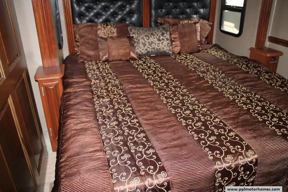 Featuring four slide-outs, a bunkhouse layout, and sleeping capacity for up to six people, it offers an expansive residential-style interior that includes a king-size master suite, mid-coach bunk beds, and two full bathrooms, one of which is a spacious rear bath with dual sinks and a large shower. The living area is equipped with premium furnishings, theater seats, convertible dinette, multiple TVs, fireplace, and high-end kitchen appliances, while upscale touches like heated tile floors, fully body paint, washer/dryer, and tankless water heater enhance comfort. With a 15,000-pound towing capacity, 150-gallon fuel tank, and ample storage, the Berkshire XLT 45A blends power, durability, and upscale amenities, making it ideal for extended trips or luxury RV living. Please note that this coach is currently in the process of having some repair work done on a compartment door from some minor road damage.
