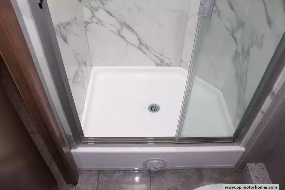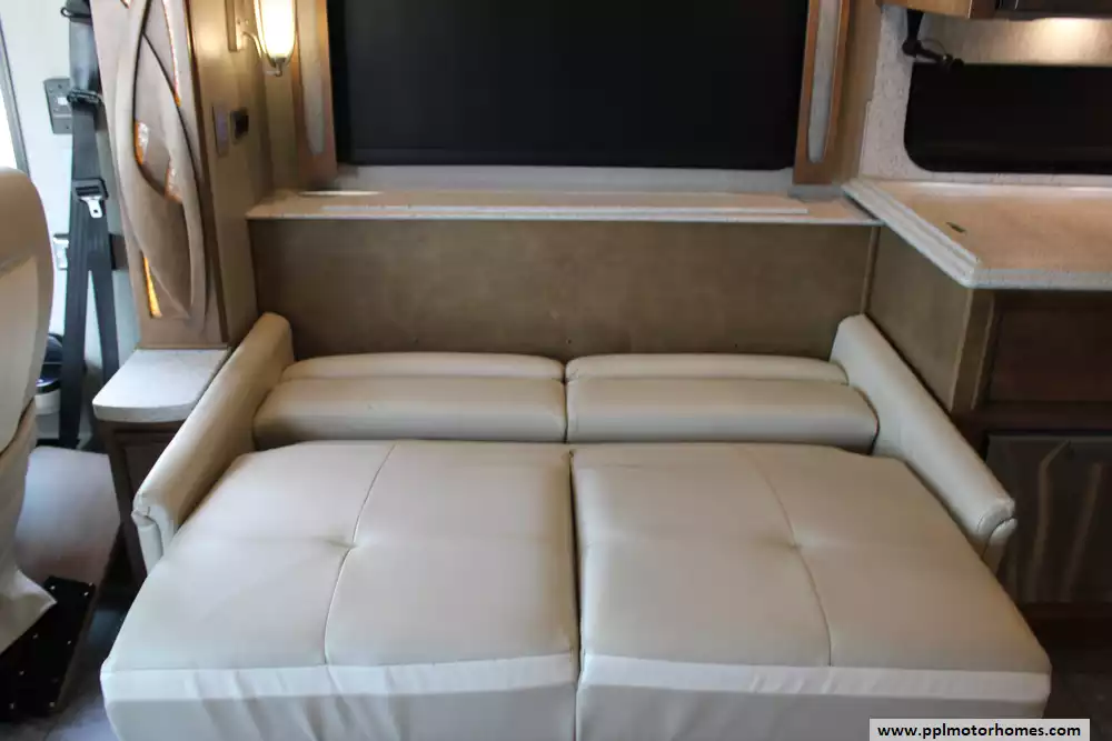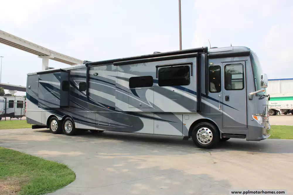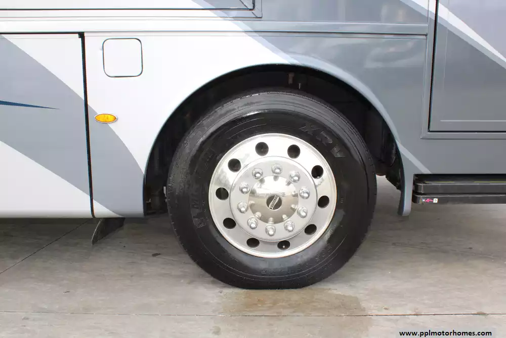 Specs: Length: 43.83 ft., Width: 8.46 ft., Height: 12.92 ft., Interior Height: 6.92 ft., Fuel Tank Capacity: 100 gal., Total Fresh Water Tank Capacity: 105 gal., Total Gray Water Tank Capacity: 65 gal., Total Black Water Tank Capacity: 45 gal., Total Number of Propane Tanks: 1, Total Propane Tank Capacity: 136 lbs.