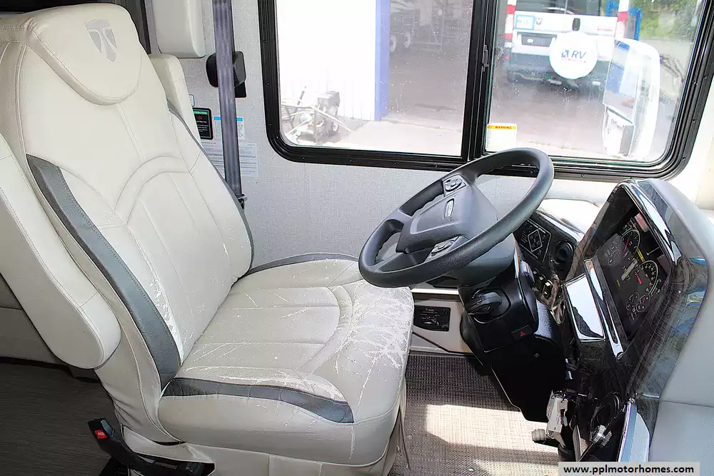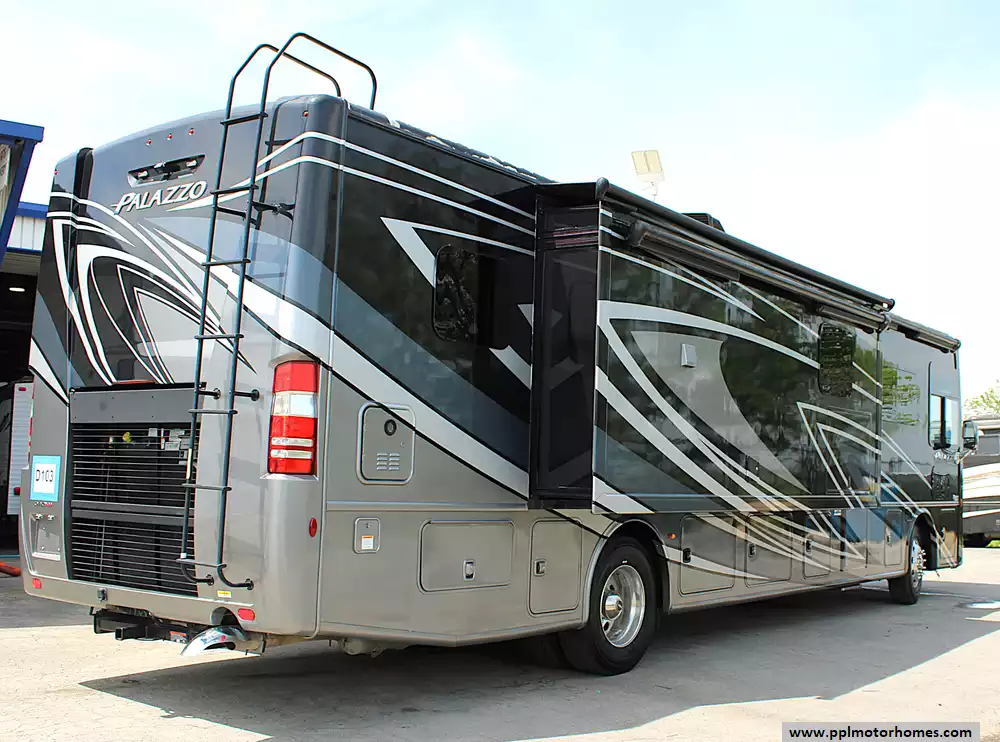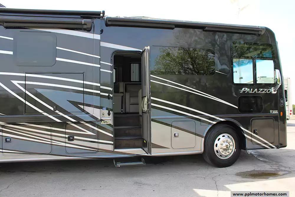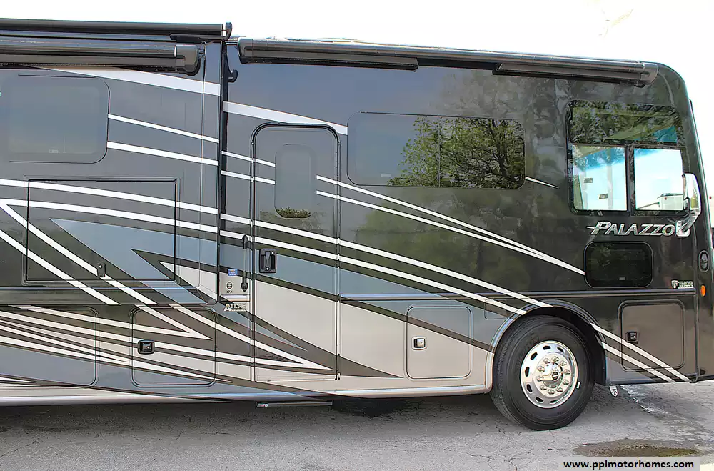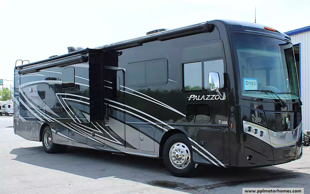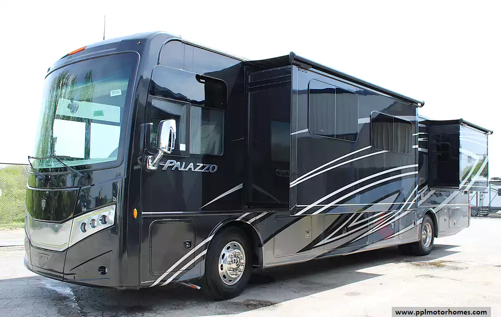 2023 Thor Palazzo 37.4 Diesel Motorhome -- Step into luxury and functionality with this spacious diesel coach designed for comfort on every level. Built on a dependable diesel platform, this unit features multiple slide-outs that open up an incredibly roomy interior, along with a highly desirable bath-and-a-half floor plan. Up front, you'll find plush seating with a sofa and dinette, swivel captain's chairs, a drop-down overhead bunk, and a large living area TV. Additional highlights include automatic leveling, backup and side-view cameras, power patio awning, and plenty of exterior storage for all your gear.