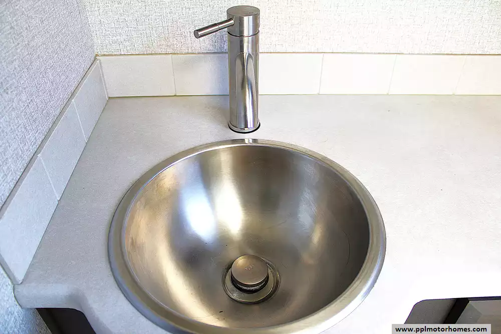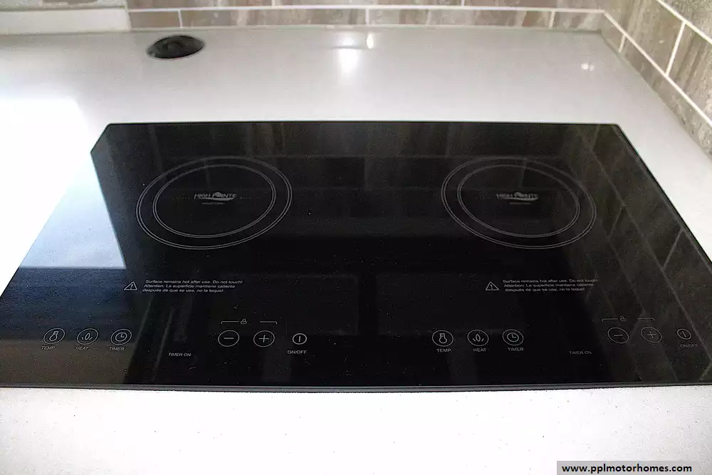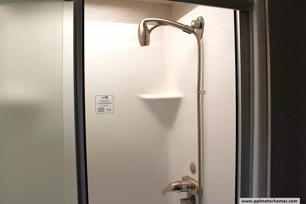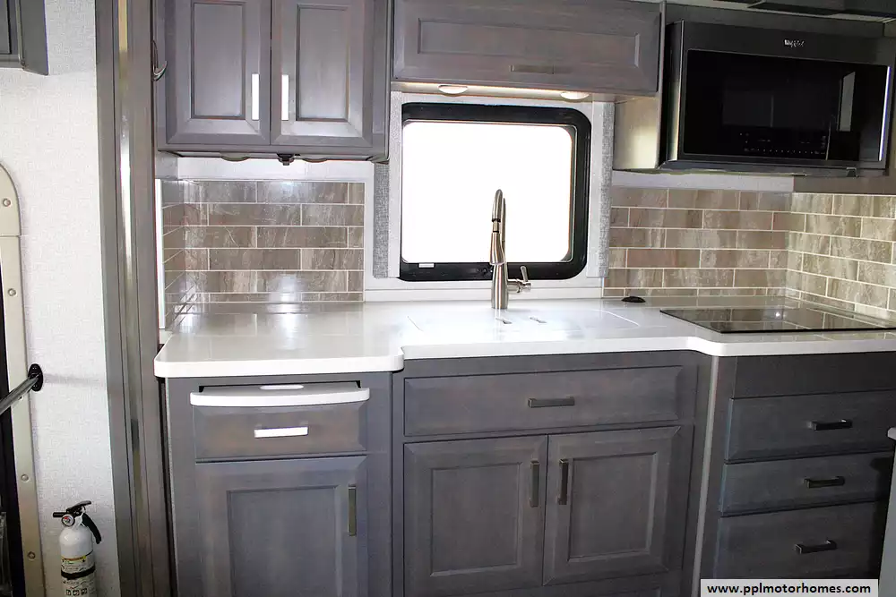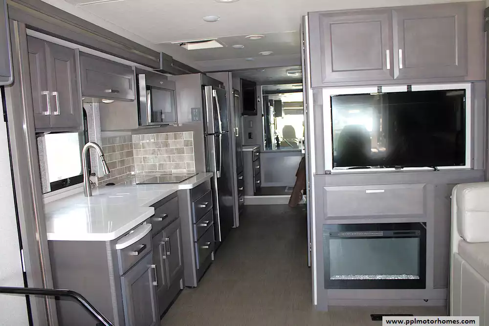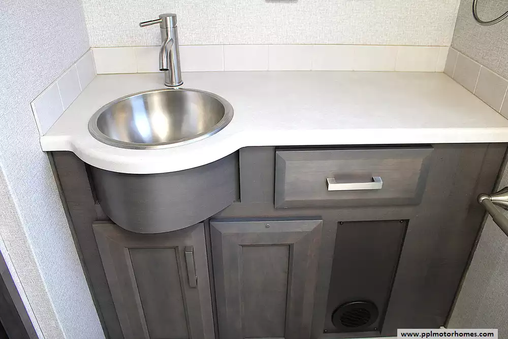 The mid-coach kitchen is fully equipped for extended travel, featuring solid surface countertops, a residential refrigerator with ice maker, convection microwave, 3-burner cooktop, stainless steel sink, and generous pantry space. This layout truly shines with its bunk bed hallway--perfect for kids or guests--along with washer/dryer prep and added storage. The half bath in the middle of the coach is a huge convenience, while the full rear bathroom offers a large shower, vanity, linen storage, and plenty of room to move around. Additional features include ducted A/C, furnace, tankless/on-demand hot water system (varies by setup), and a reliable onboard generator for off-grid capability.