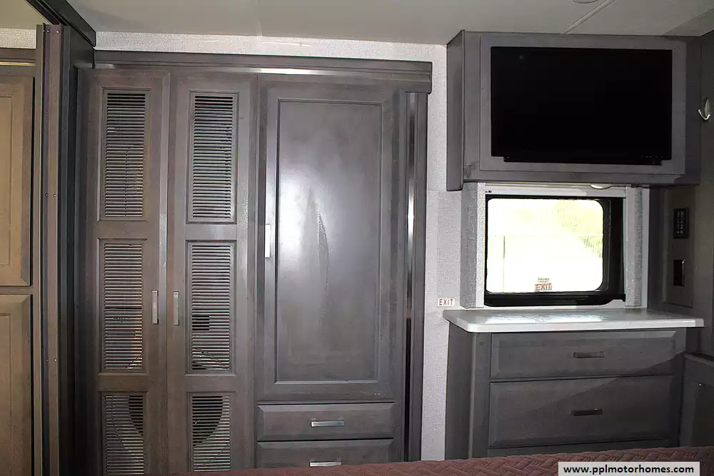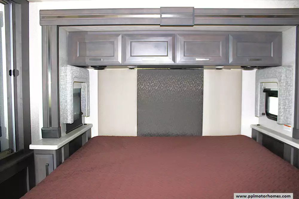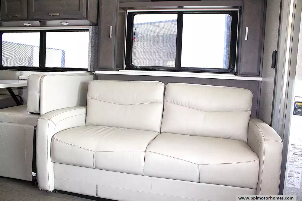 In the rear master suite, enjoy a king-size bed slide, large wardrobe, dresser storage, and a dedicated TV, giving you a private retreat after a long day. This coach sleeps 8--10 people comfortably with the king bed, bunk beds, drop-down bunk, and convertible sofa/dinette. With premium features like diesel power, multiple sleeping areas, bath-and-a-half convenience, ample storage, and family-friendly layout, the Palazzo 37.4 is built for both weekend getaways and full-time living.