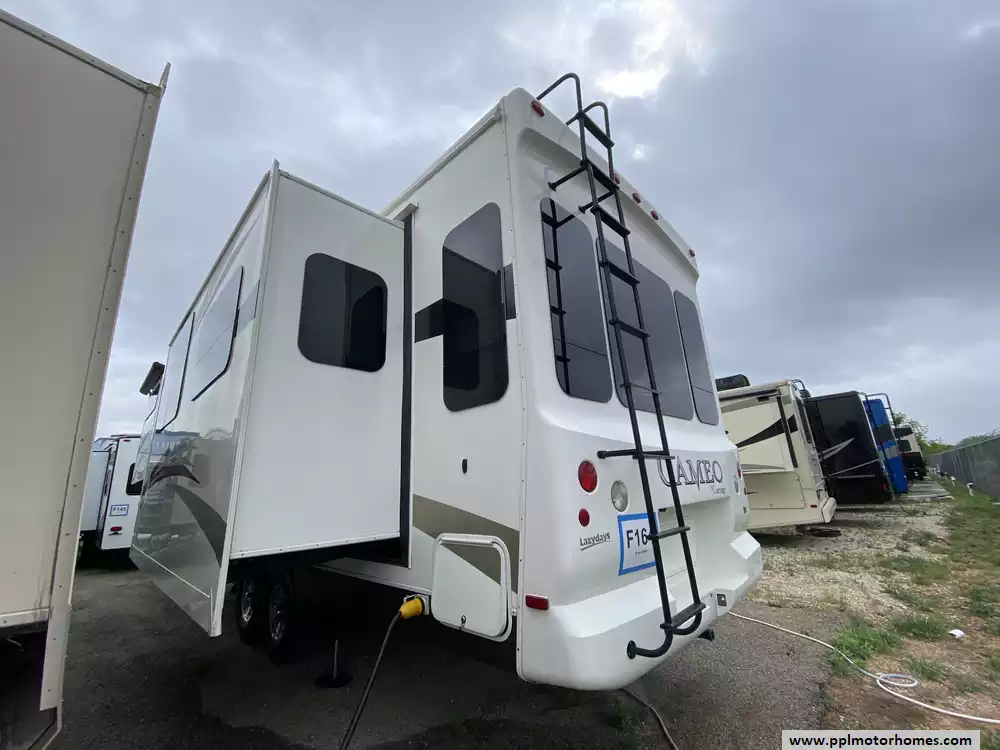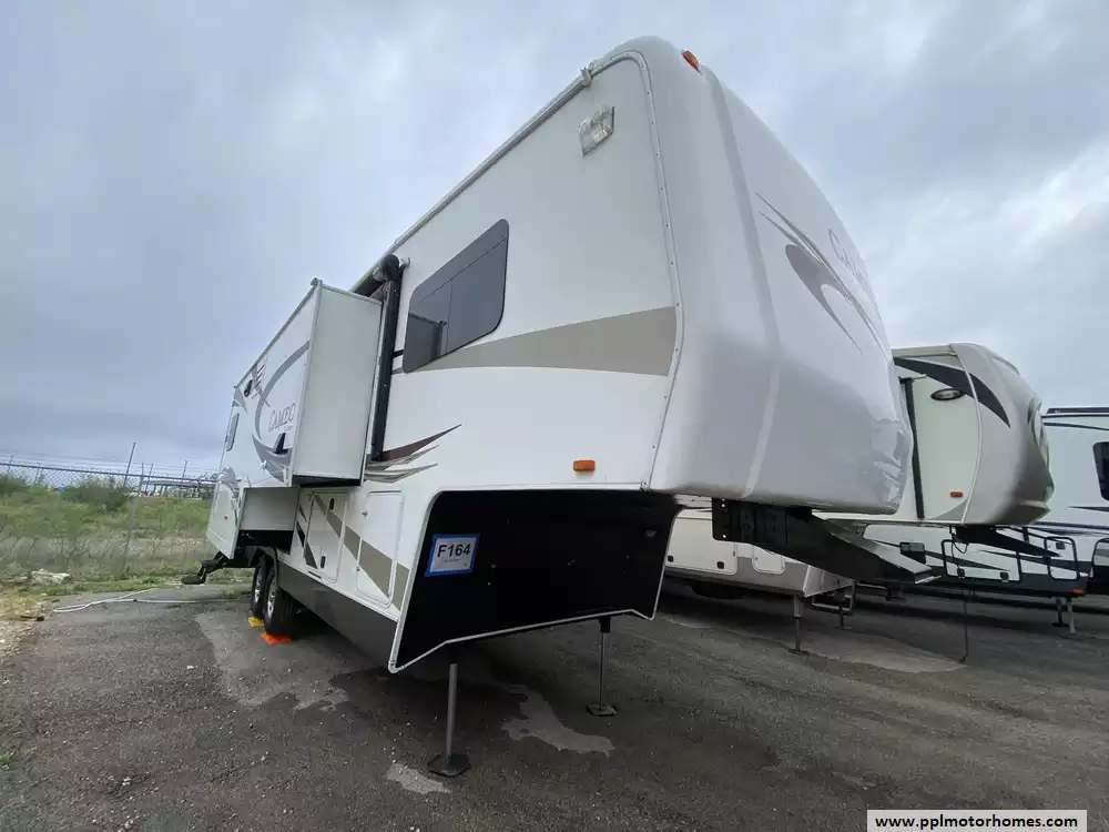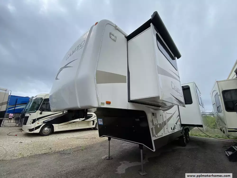 Experience the superior craftsmanship and enduring reputation of the 2011 Carriage Cameo 31KSLS, a 34-foot fifth wheel widely regarded as a premier Resort Vehicle for extended stays. Carriage is celebrated for its robust construction and residential-grade quality, and this model lives up to that legacy with a durable fiberglass body and a reliable TPO roof. Setting up camp is effortless thanks to the high-performance hydraulic landing gear, while the three slide-outs dramatically expand the living area to create a spacious, home-like atmosphere. The exterior is well-appointed for outdoor living, featuring an automatic main awning, dedicated slide awnings, and a convenient outside shower for quick clean-ups after a day of adventure.