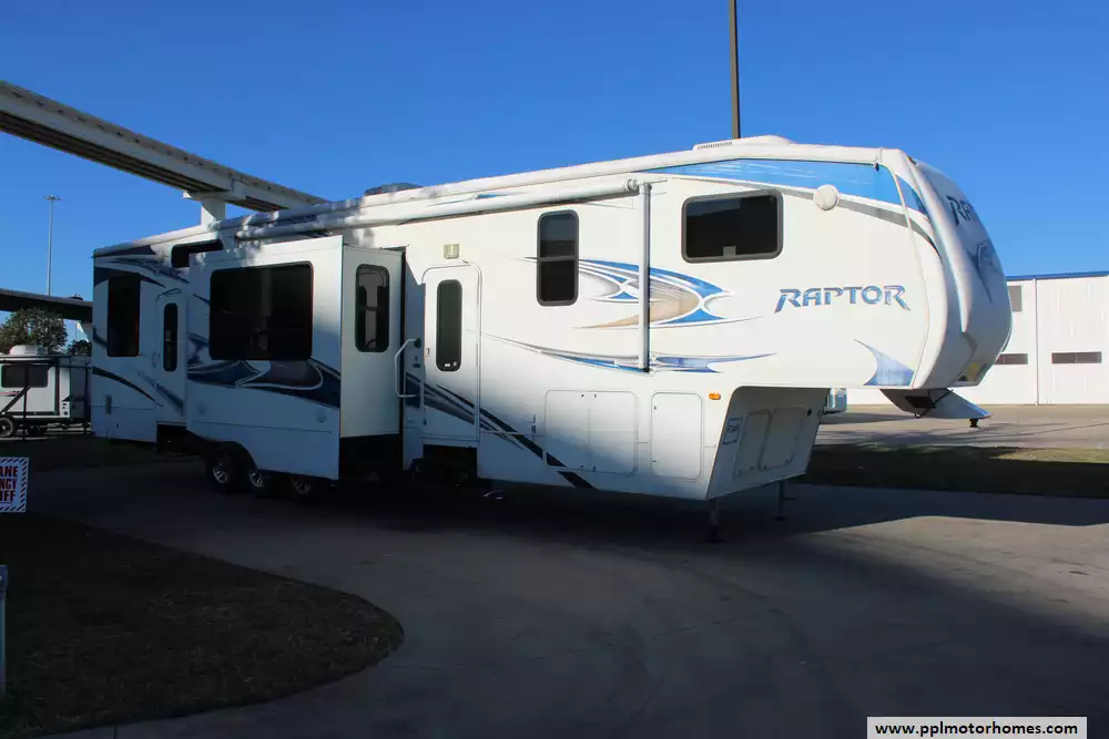 This 2011 Raptor by Keystone 3912 LEV works well for families or groups traveling together. Comforts Include...Hydraulic Landing Gear, 3 Slide-outs, 2 Ducted Air Conditioners, Double Door Gas/110v Dometic Refrigerator, Automatic Main Awning, Outside Speakers, 3 TVs, Outside Shower, Microwave, 3 Burner Range, and Oven.