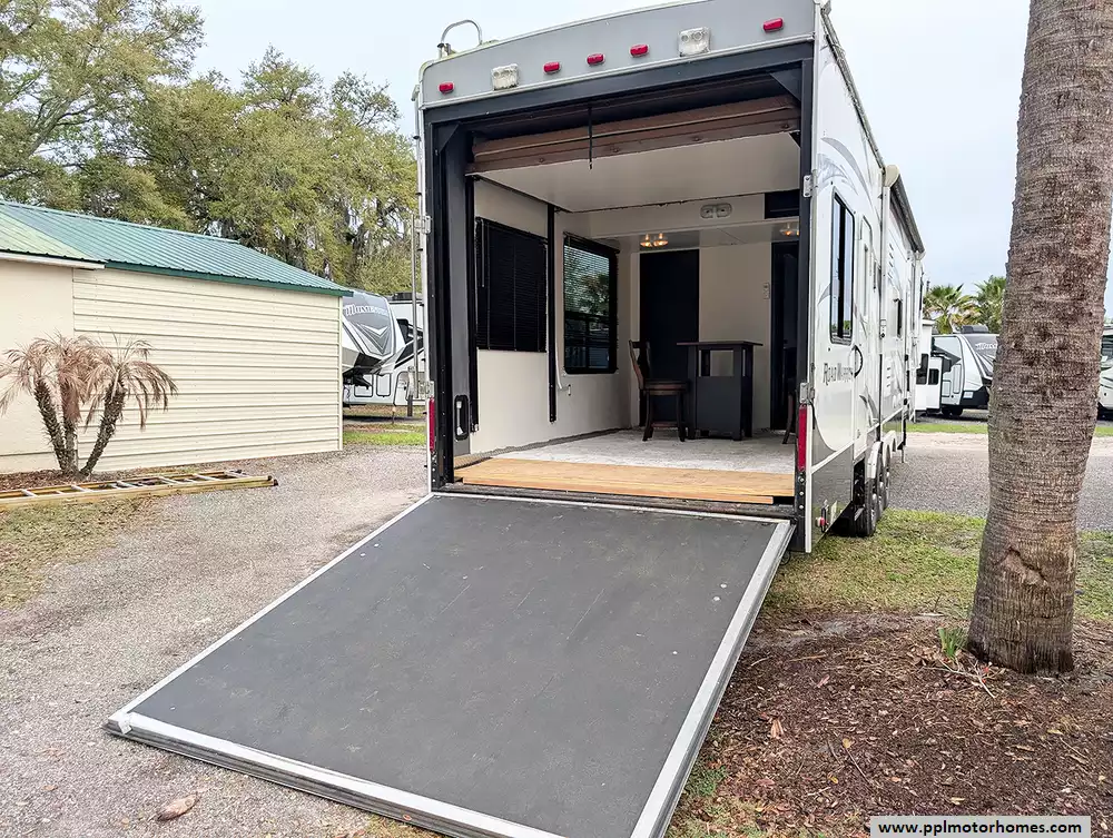 The 2013 Heartland Road Warrior 415RW is a premier choice for those who refuse to choose between rugged utility and high-end residential luxury. This 43-foot fifth wheel is built with a durable fiberglass exterior and a reliable rubber roof, offering the expansive interior space and wide-body design that have made the Road Warrior series a leader in the luxury toy hauler market. With three large slide-outs, the layout provides an open and inviting atmosphere, complemented by a cozy fireplace and a full entertainment center featuring a TV and DVD player. The coach is designed for ultimate climate control, equipped with three ducted air conditioners to ensure total comfort throughout the massive living space regardless of the temperature outside.