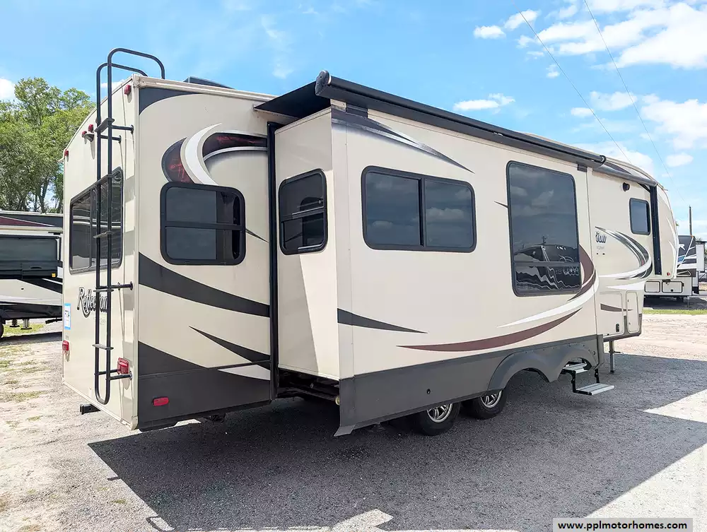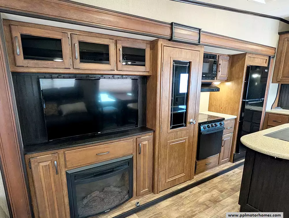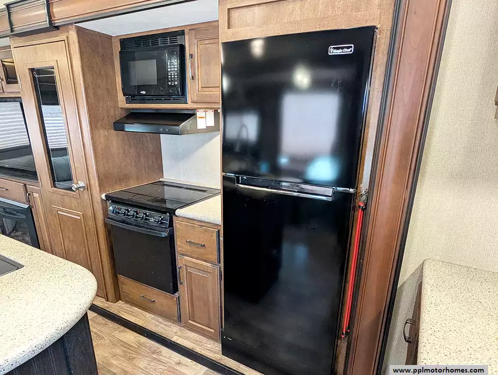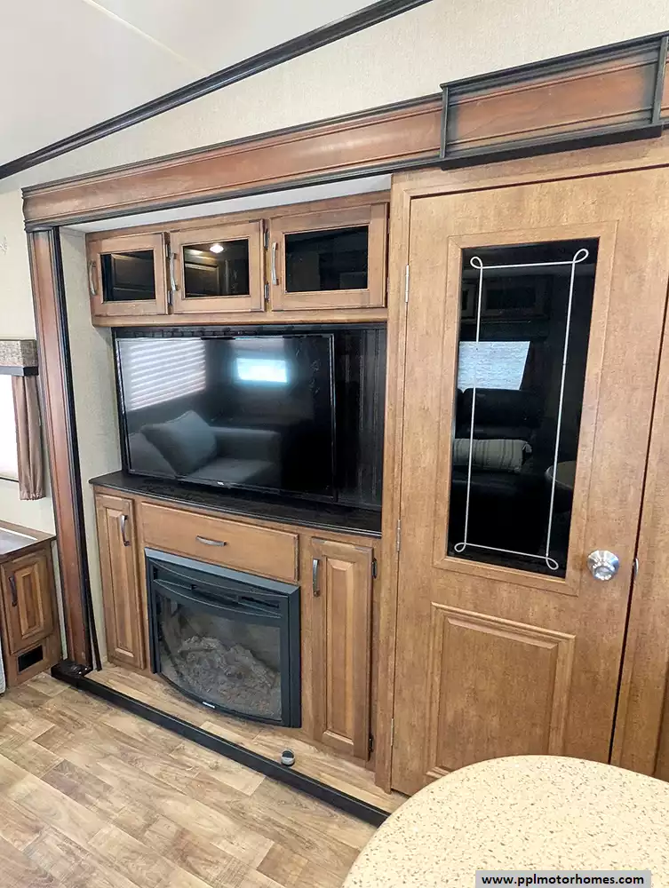 Inside, you will find a fully-equipped kitchen featuring a double-door 110v Magic Chef refrigerator, a three-burner range, an oven, and a microwave. The inviting living area is anchored by a warm fireplace and a TV, all kept at the perfect temperature by two ducted air conditioners. Setting up camp is effortless with the electric landing gear and an automatic main awning that extends your living space outdoors. Complete with outside speakers and an outside shower for your adventures, this Reflection 303RLS delivers a premium camping experience in every detail.