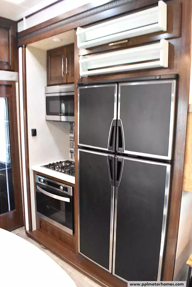 This 2017 Cyclone 4005 has a Hydraulic Landing Gear, 3 Slide-outs, Onan Gas Generator, 3 Ducted Air Conditioners, 4 Door Gas/12v Dometic Refrigerator (Additional Refrigerator Present), Automatic Main Awning, Washer/Dryer Connections, Outside Entertainment System, 4 TVs, Outside Shower, Fireplace, Central Vacuum, Microwave, 3 Burner Range, Oven