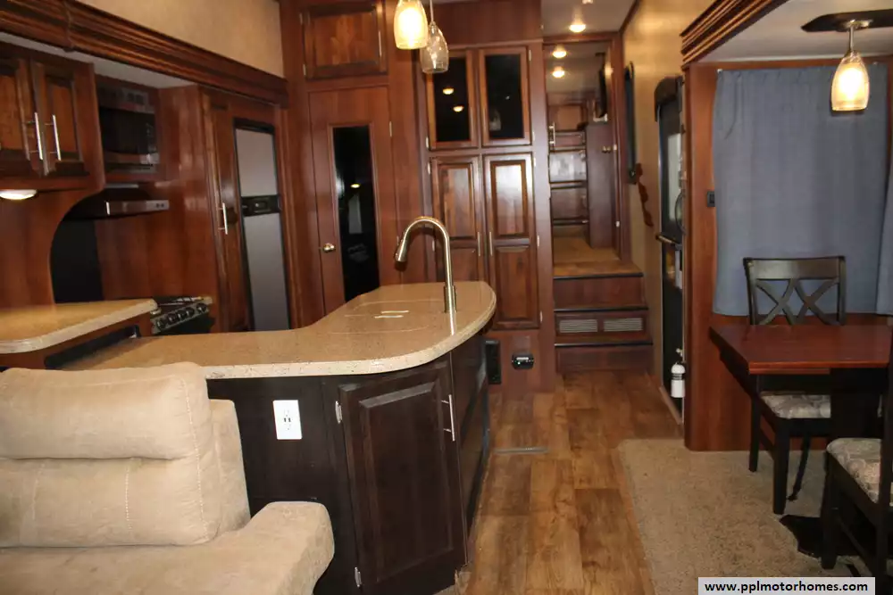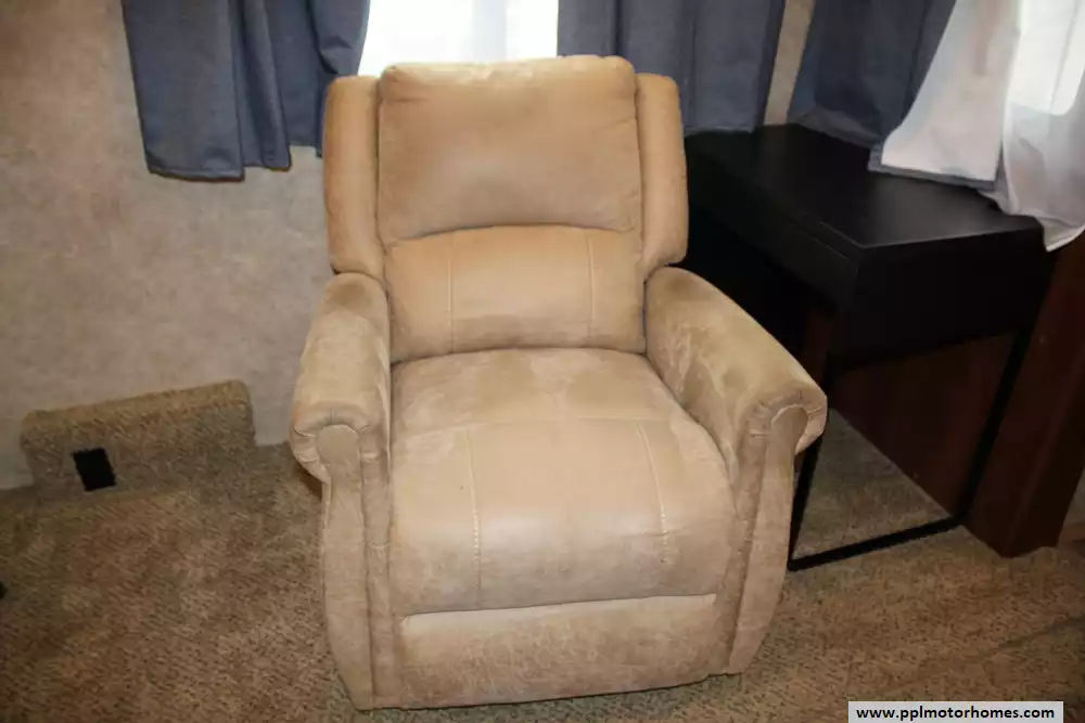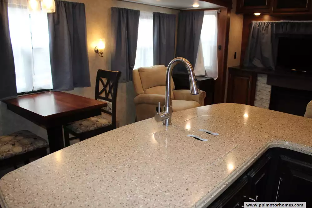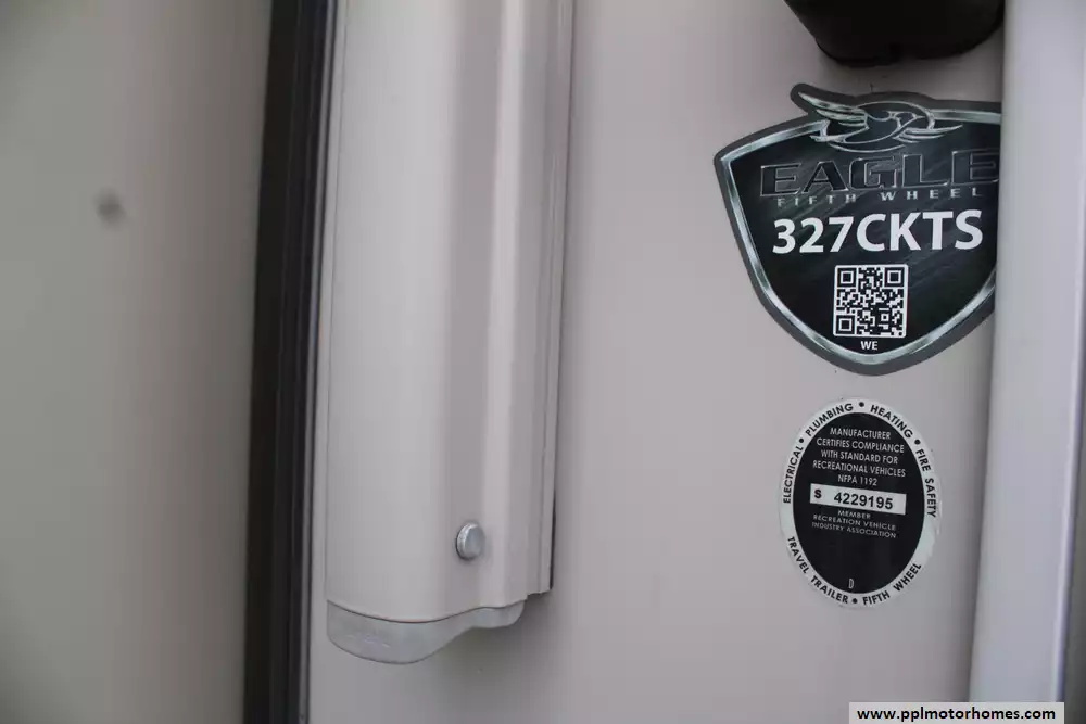 The 2017 Jayco Eagle 327CKTS is a luxurious fifth-wheel designed to sleep up to four, featuring three slide-outs that create an expansive, open living area and well-appointed kitchen. Built on Jayco's TuffShell structure with Climate-Shield insulation and Magnum Truss roofing, it offers four-season durability. The rear living space includes an L-shaped sofa, recliners, theater-style entertainment center with pop-up 48" HDTV and LED fireplace, plus a free-standing dinette. In the front is a private bedroom with a queen bed, roomy walk-in closet, and washer/dryer prep. The fully equipped kitchen boasts a three-burner range, microwave, pantry, Corian solid-surface counters, and stainless-steel sink, complemented by dual USB ports and a 15 k BTU A/C (and has 2nd A/C). A central bathroom features a shower with seat, linen storage, and porcelain toilet. Standard exterior comforts include a 19' electric awning, pass-through storage, marine-grade speakers, tinted frameless windows, rear power jacks, and solar prep. The 327CKTS strikes a strong balance of comfort, functionality, and true home-on-wheels luxury!