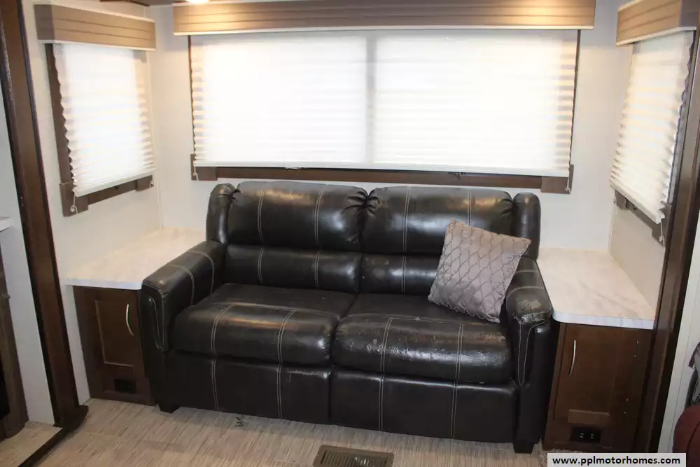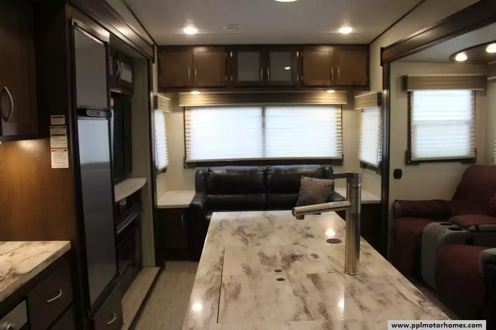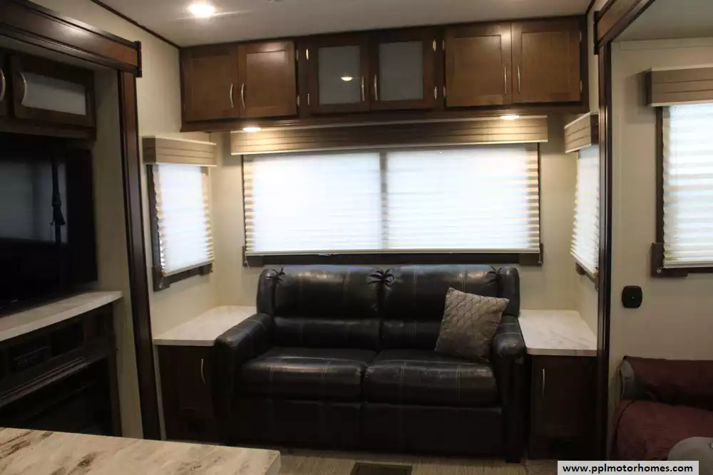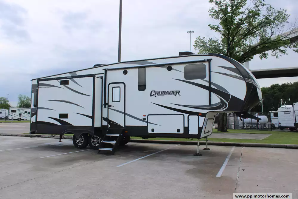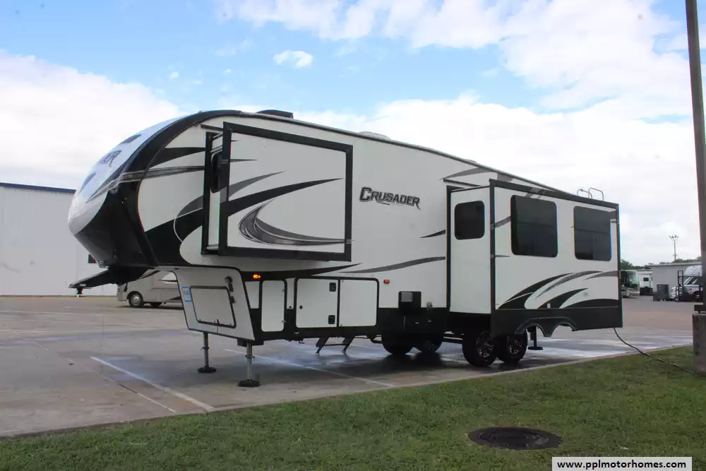 This 2018 Prime Time Crusader 315RST has a Hydraulic Landing Gear, 3 Slide-outs, 2 Ducted Air Conditioners, Double Door Gas/110v Norcold Refrigerator, Automatic Main Awning, Outside Entertainment System, TV, Outside Shower, Fireplace, Microwave, 3 Burner Range.