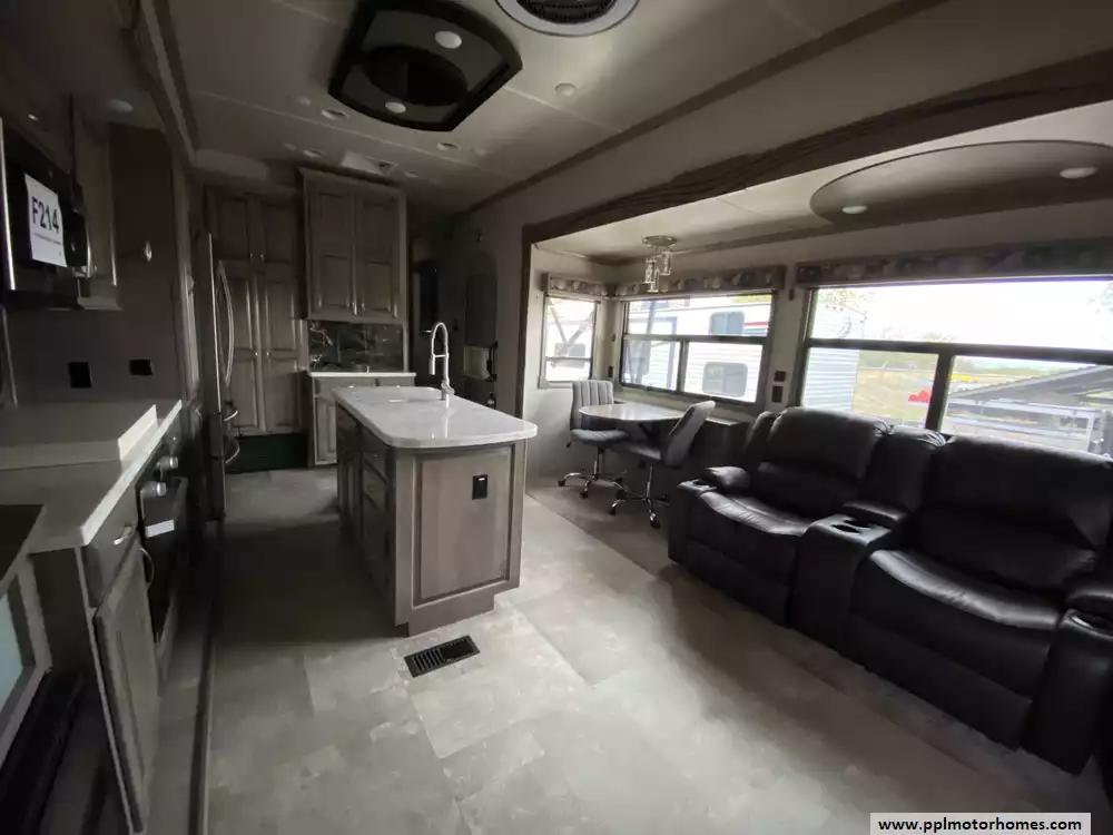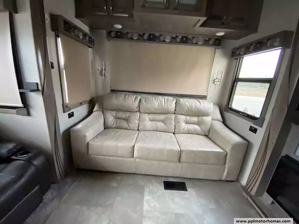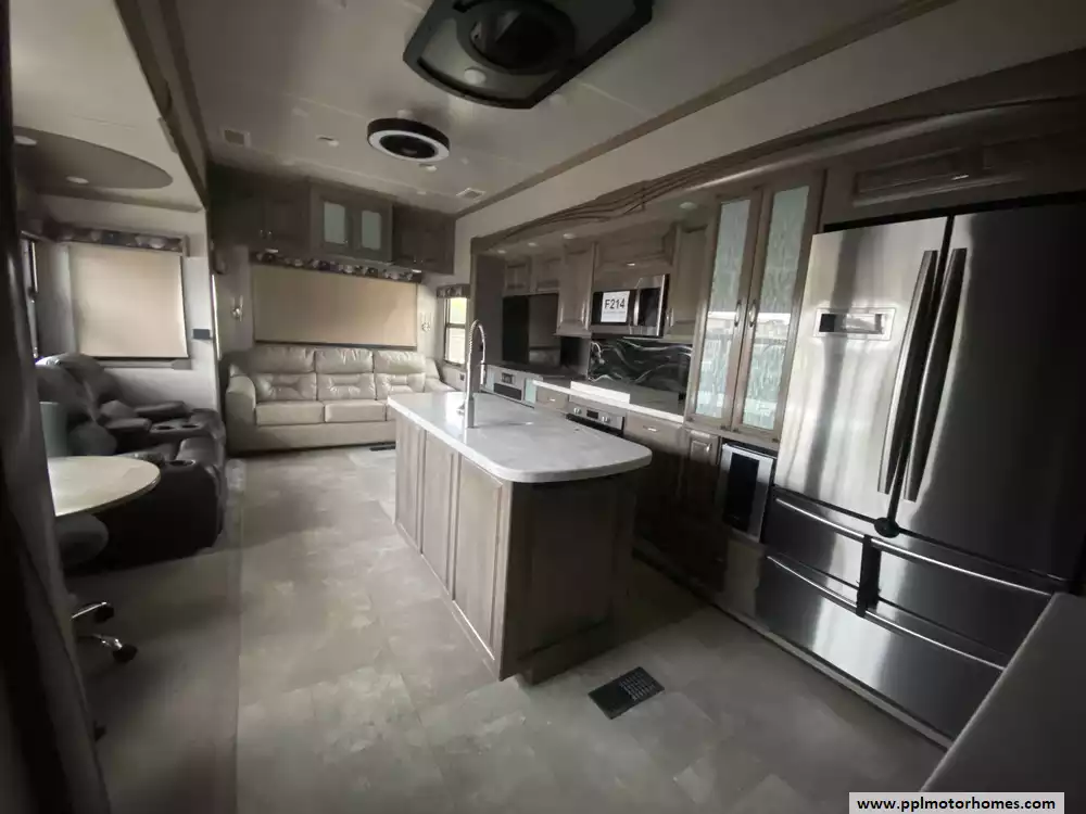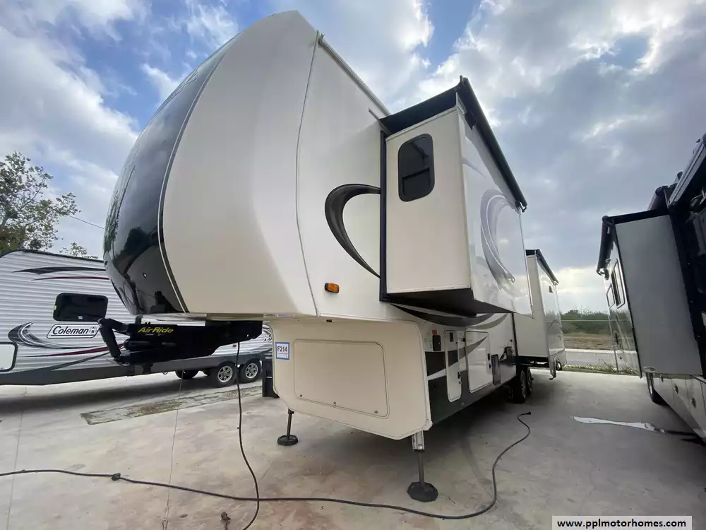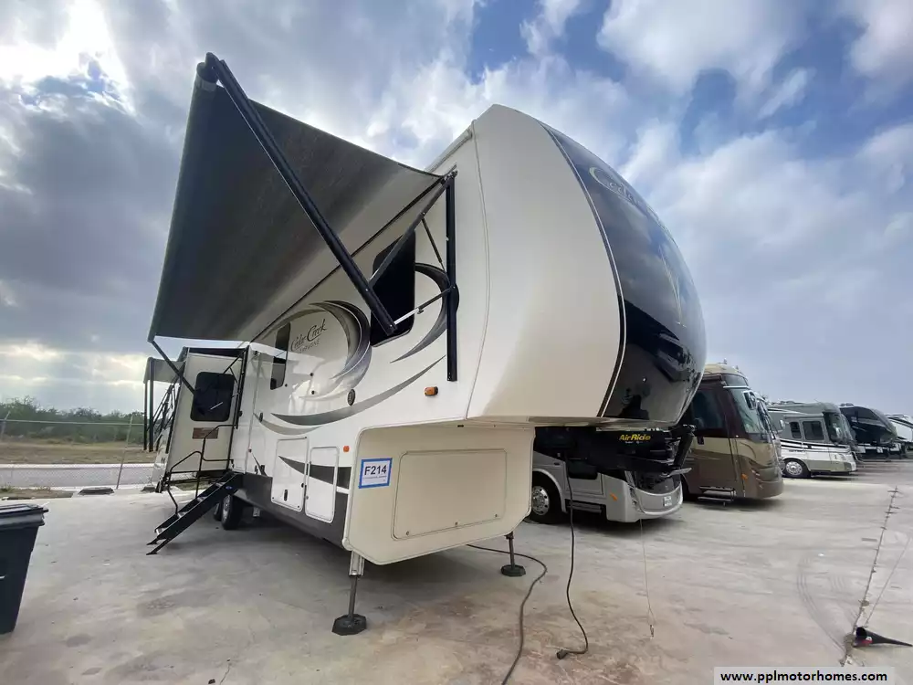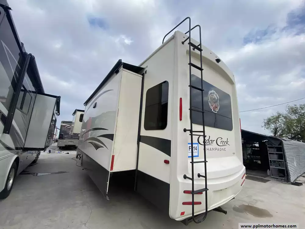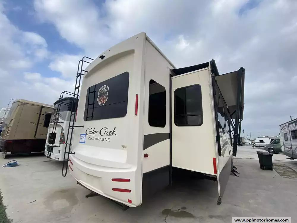 This 2019 Cedar Creek Champagne 38EL has Hydraulic Landing Gear, 3 Slide-outs, 2 Ducted Air Conditioners, Side by Side 110v Residential Insignia Refrigerator, In-Fridge Ice Maker, Automatic Main Awning And Window/Slide Awnings, Washer/Dryer Connections, Outside Entertainment System, 2 TVs, DVD Player, Outside Shower, Fireplace, Central Vacuum, Microwave, 3 Burner Range, Oven. Well maintained Fifth Wheel.