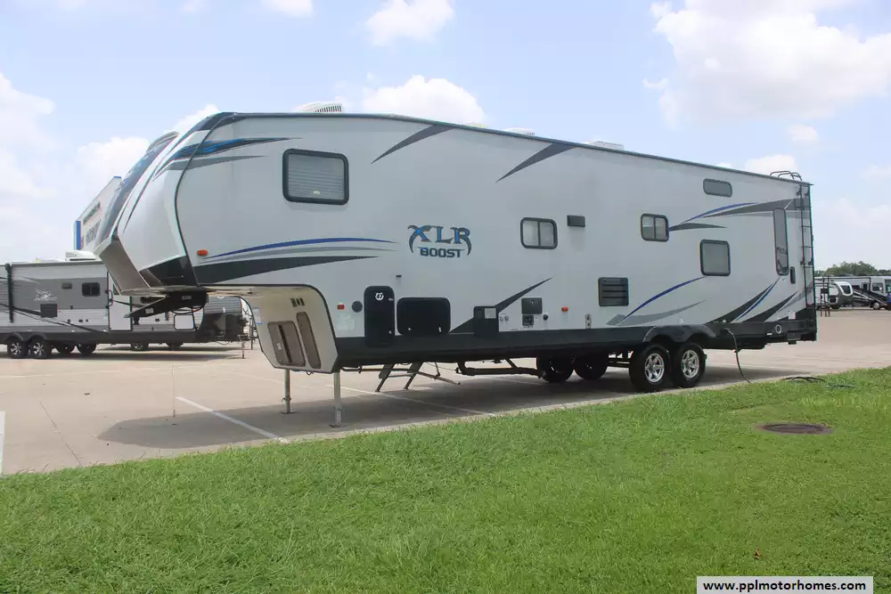 This 2019 Xlr Boost 36DSX13 is a spacious and rugged toy hauler fifth-wheel RV, perfect for hauling motorcycles, ATVs, or other gear in its generous 13-ft cargo garage while offering comfortable living quarters. Features Include...Electric Landing Gear, 1 Slide-out, Onan Gas Generator, 2 Ducted Air Conditioners, Double Door Gas/110v Norcold Refrigerator, Automatic Main Awning, Outside Speakers, 2 TVs, Outside Shower, Convection Microwave, and 3 Burner Range.