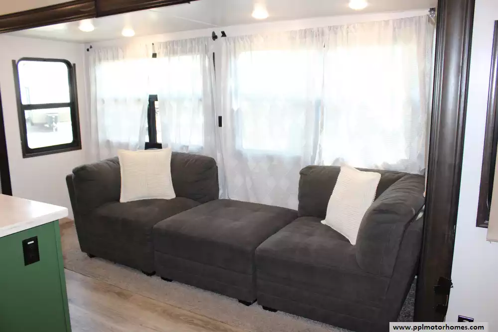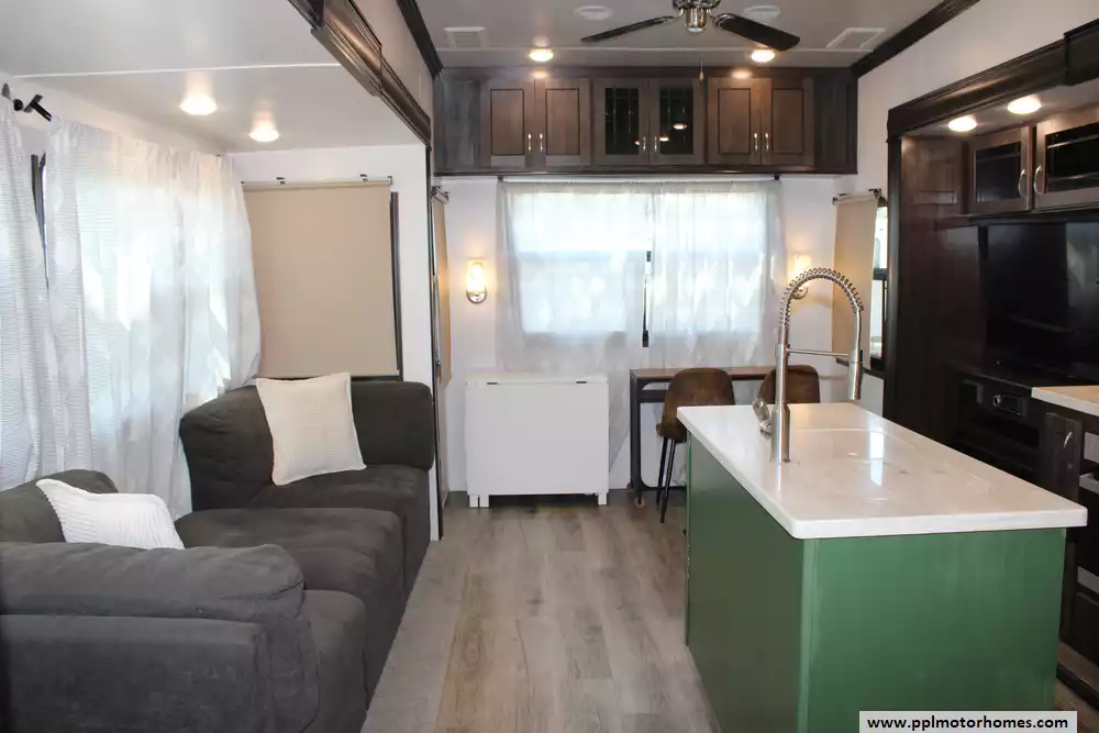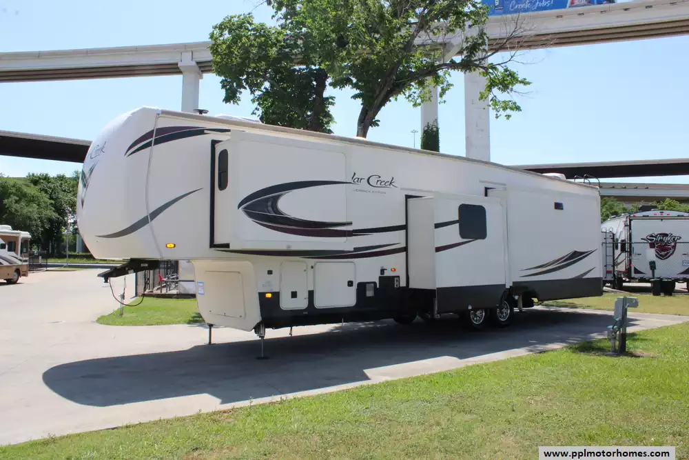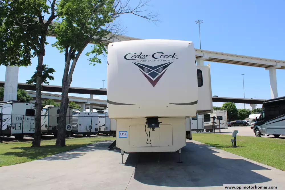 This 2020 Cedar Creek Silverback 37MBH is a luxurious fifth-wheel RV designed for families or travelers seeking a spacious and versatile living space. Features Include...4 Slide-outs, 2 Ducted Air Conditioners, Double Door Residential Insignia Refrigerator, Automatic Main Awning, Washer/Dryer Connections, Outside Speakers, 2 TVs, DVD Player, Outside Shower, Fireplace, Microwave, 3 Burner Range, and Oven. Its well-thought-out layout and quality features make it an excellent choice for travelers seeking a reliable and comfortable RV experience.