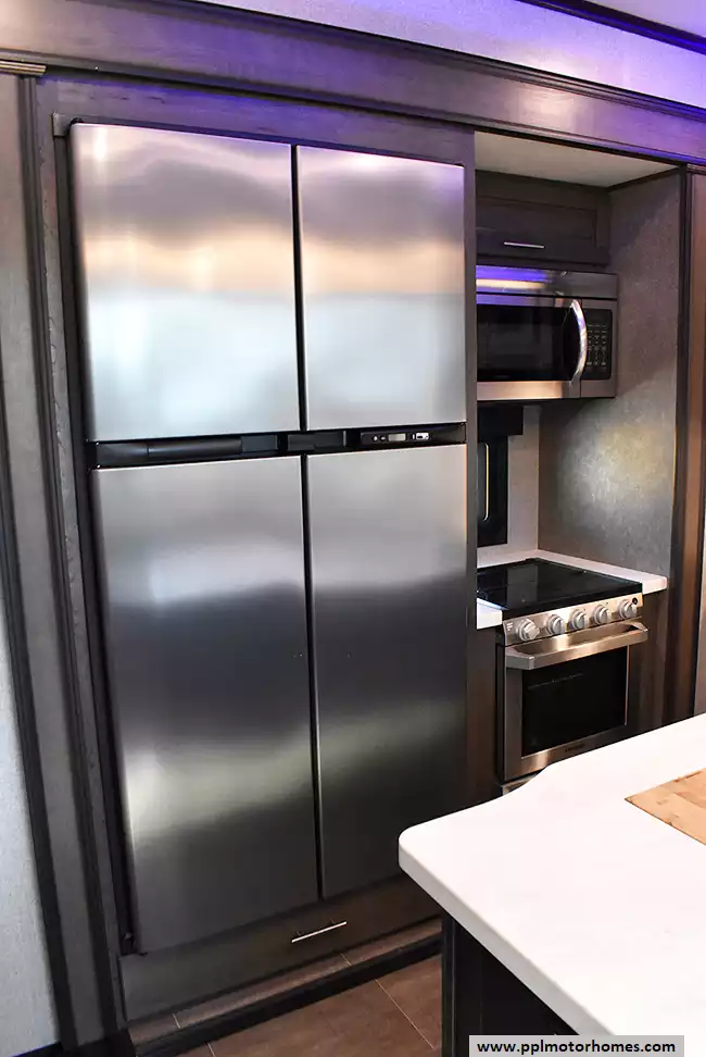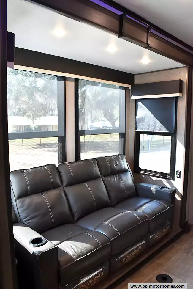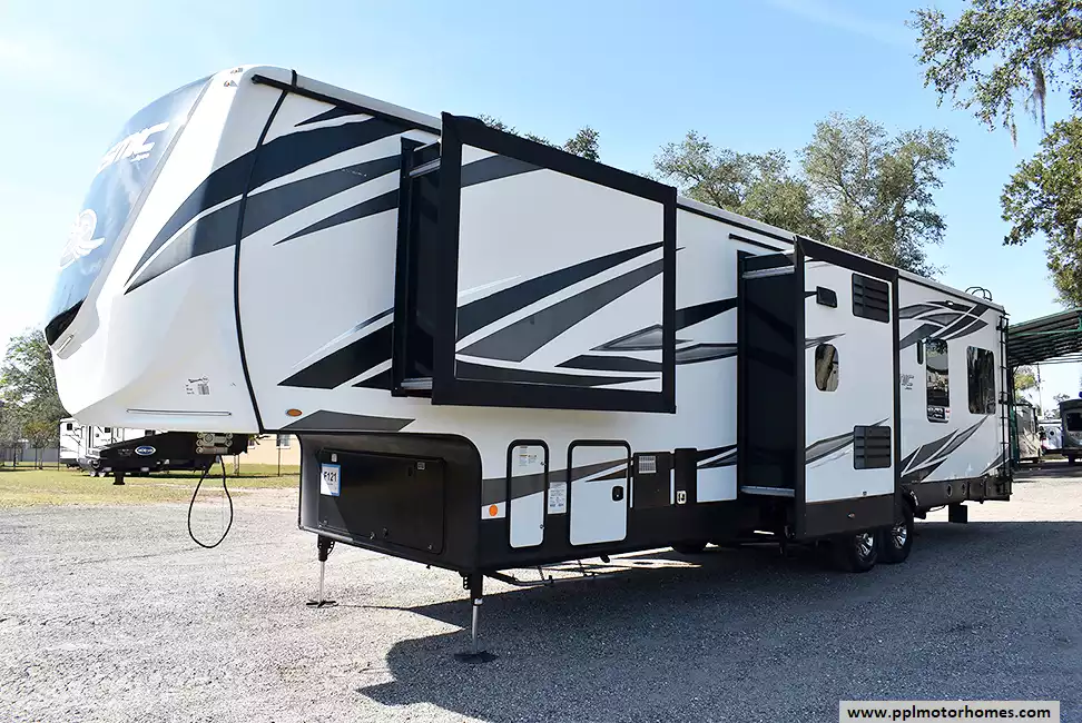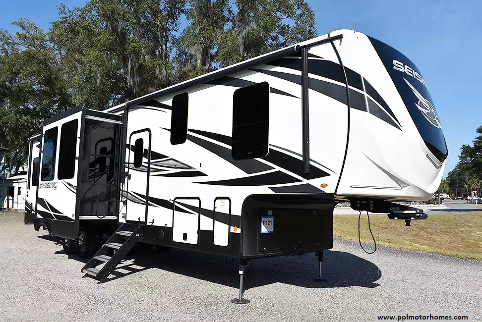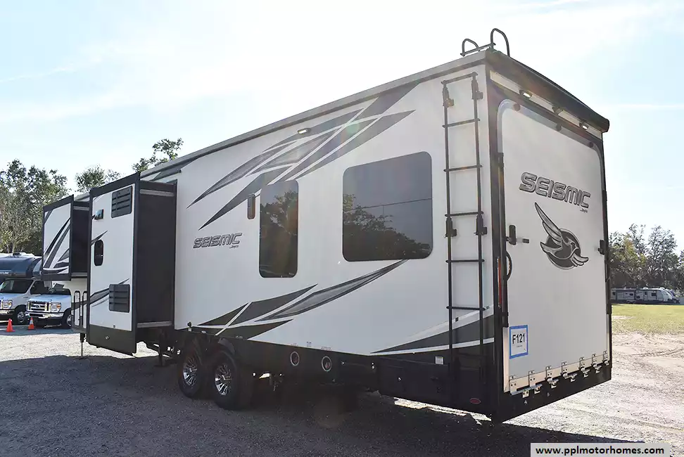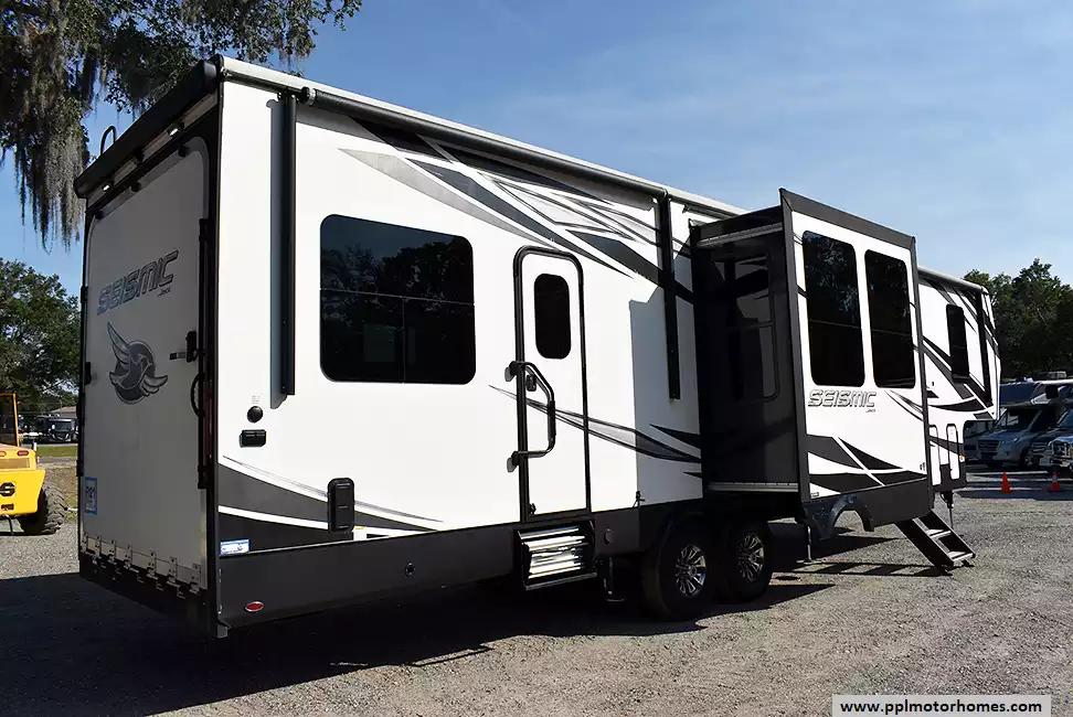 This 2020 Seismic 3512 has a Hydraulic Landing Gear, 3 Slide-outs, Onan Gas Generator, 3 Ducted Air Conditioners, 4 Door Gas/110v Norcold Refrigerator, Automatic Main Awning, Solar Panel, Heated Tanks, Satellite Receiver, Outside Speakers, 2 TVs, Outside Shower, Fireplace, Central Vacuum, Convection Microwave, 3 Burner Range, Oven