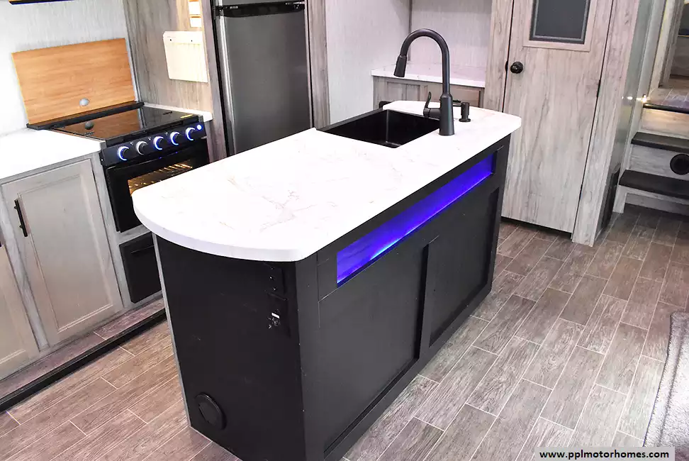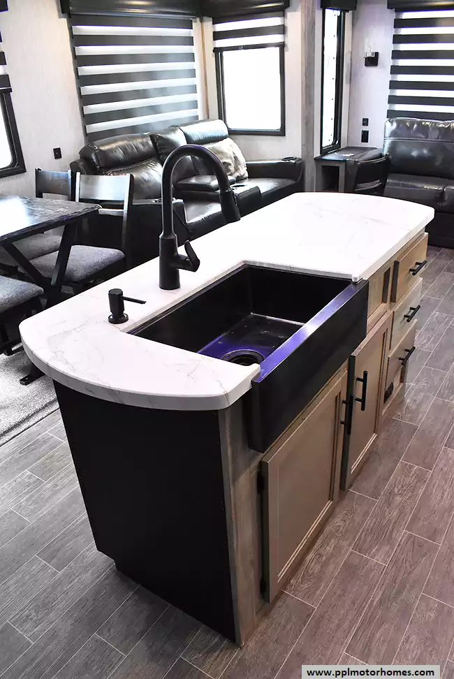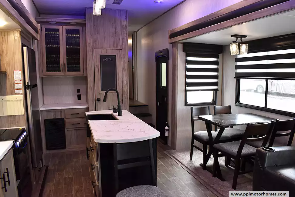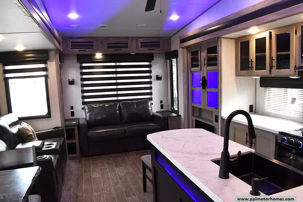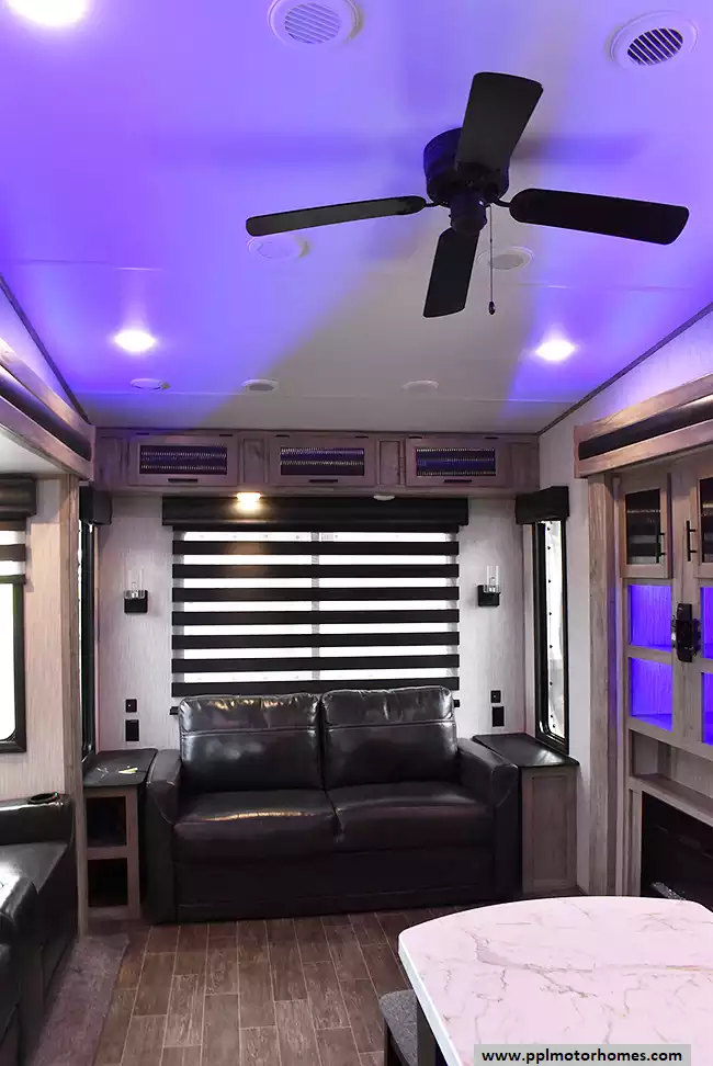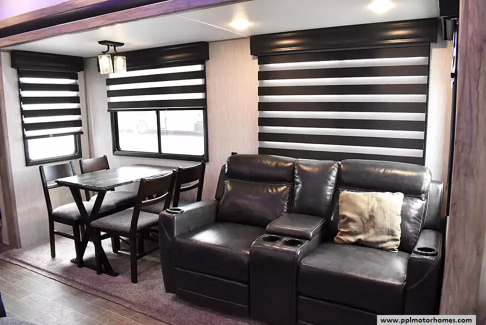 !Hit the road in style with this well-equipped fifth wheel featuring a spacious rear living layout, modern kitchen, theatre seating, electric fireplace, and panoramic windows. Outfitted for convenience and safety, it includes:Newer Goodyear Endurance tires
