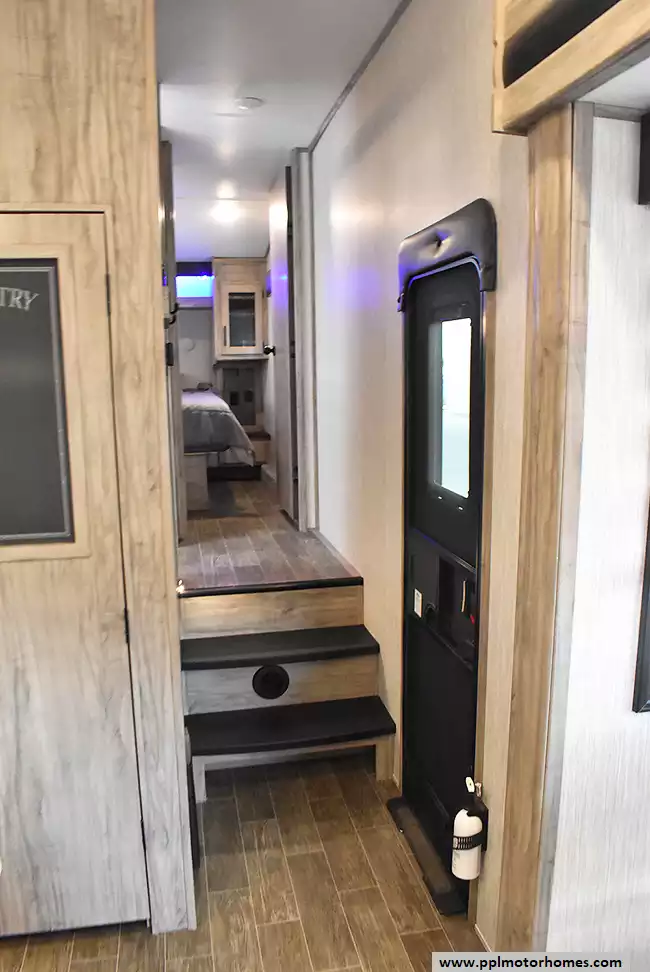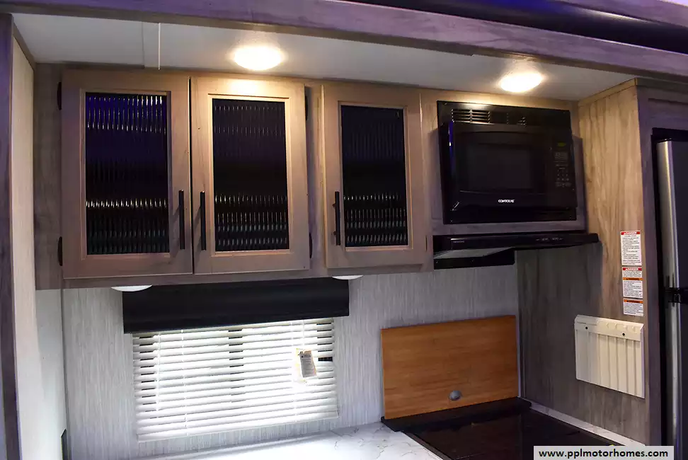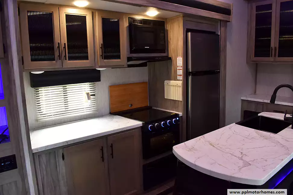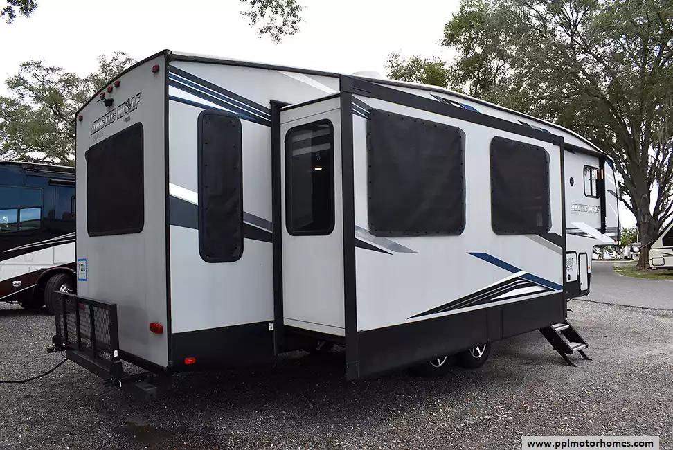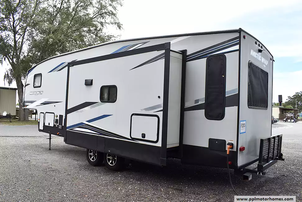 This 2021 Cherokee Arctic Wolf 291RL has an Electric Landing Gear, 2 Slide-outs, 1 Ducted Air Conditioner, Double Door 110v Everchill Refrigerator, Automatic Main Awning, Solar Panel, Outside Speakers, Outside Shower, Fireplace, Microwave