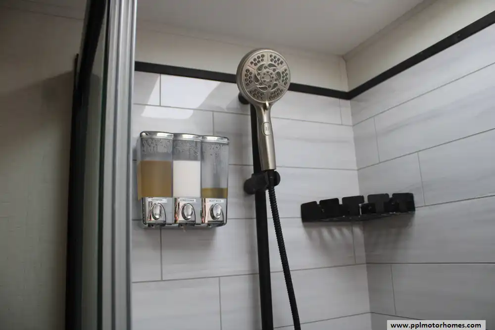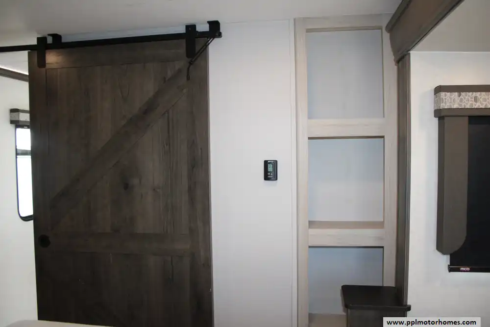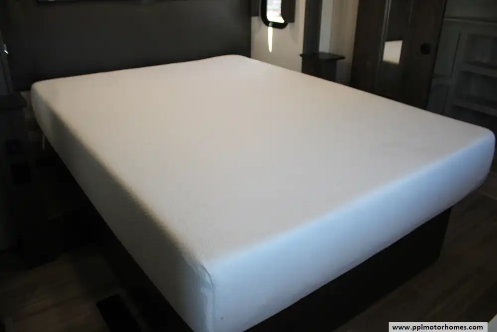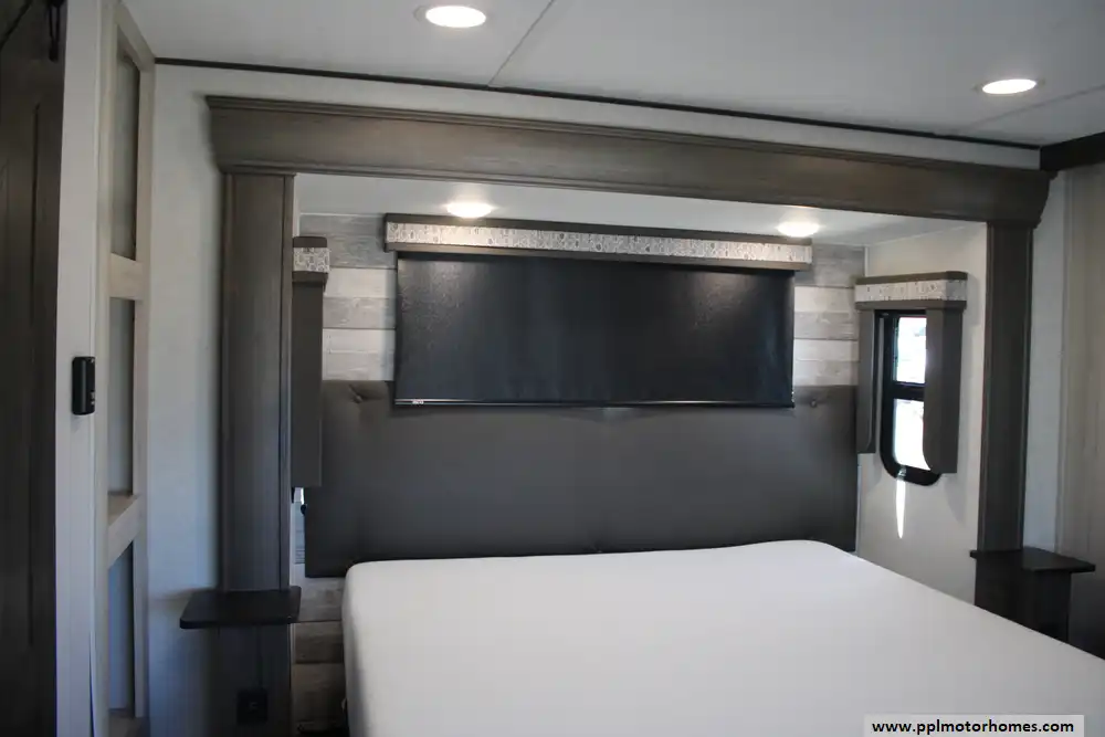 Toward the front, a private master suite includes a king bed, ample wardrobe space, washer/dryer prep, and access to a spacious bathroom, while high-end construction features like aluminum framing, heated and enclosed underbelly with heated tanks, 50-amp service, and up to three air conditioners make it suitable for extended or all-season travel.