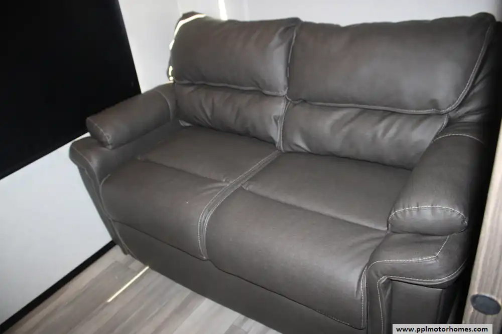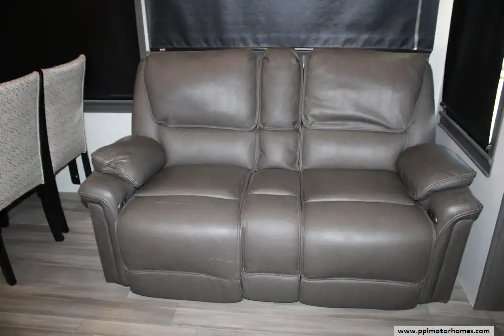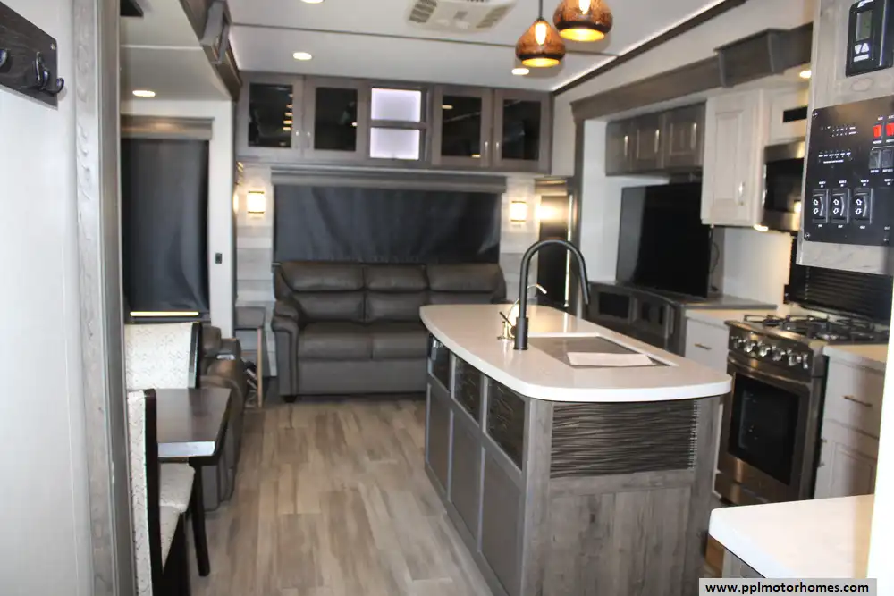 The main living area offers residential-style comfort with theater seating, a fireplace, large entertainment setup, and a fully equipped kitchen with solid-surface countertops, kitchen island, pantry, and full-size refrigerator.