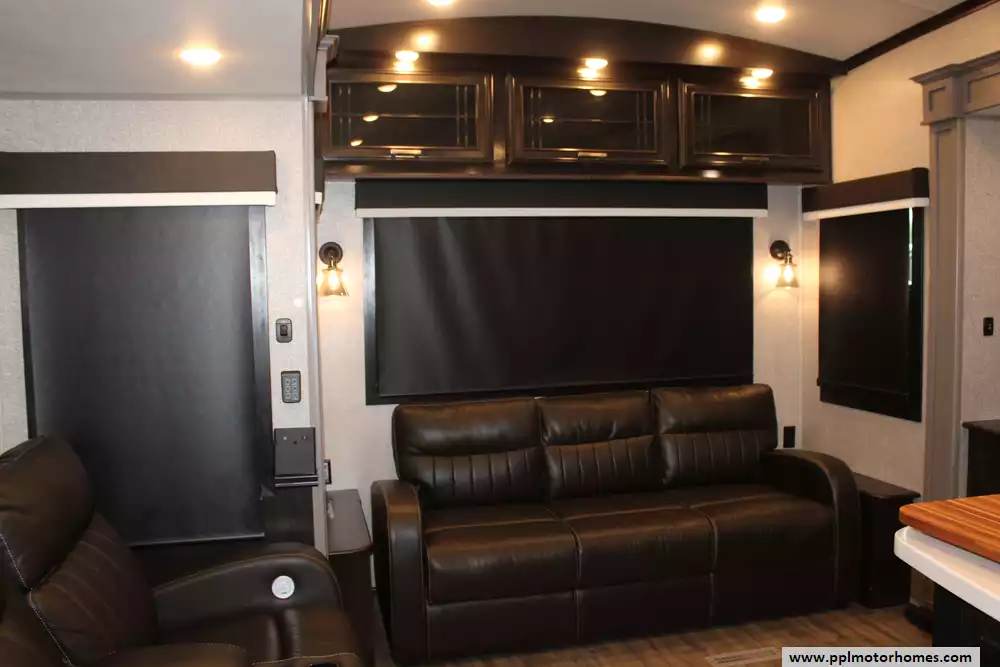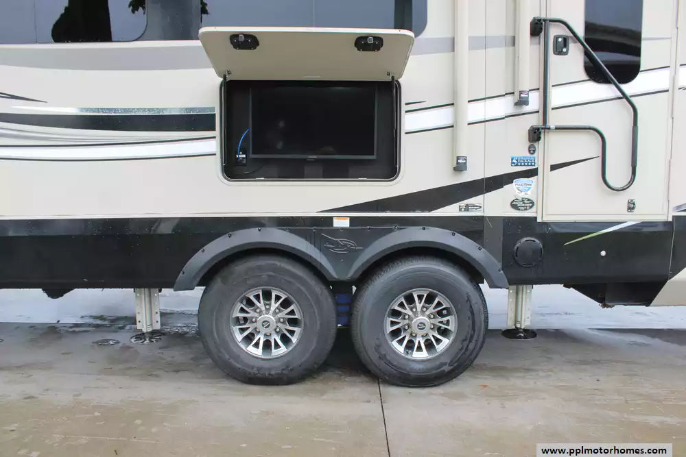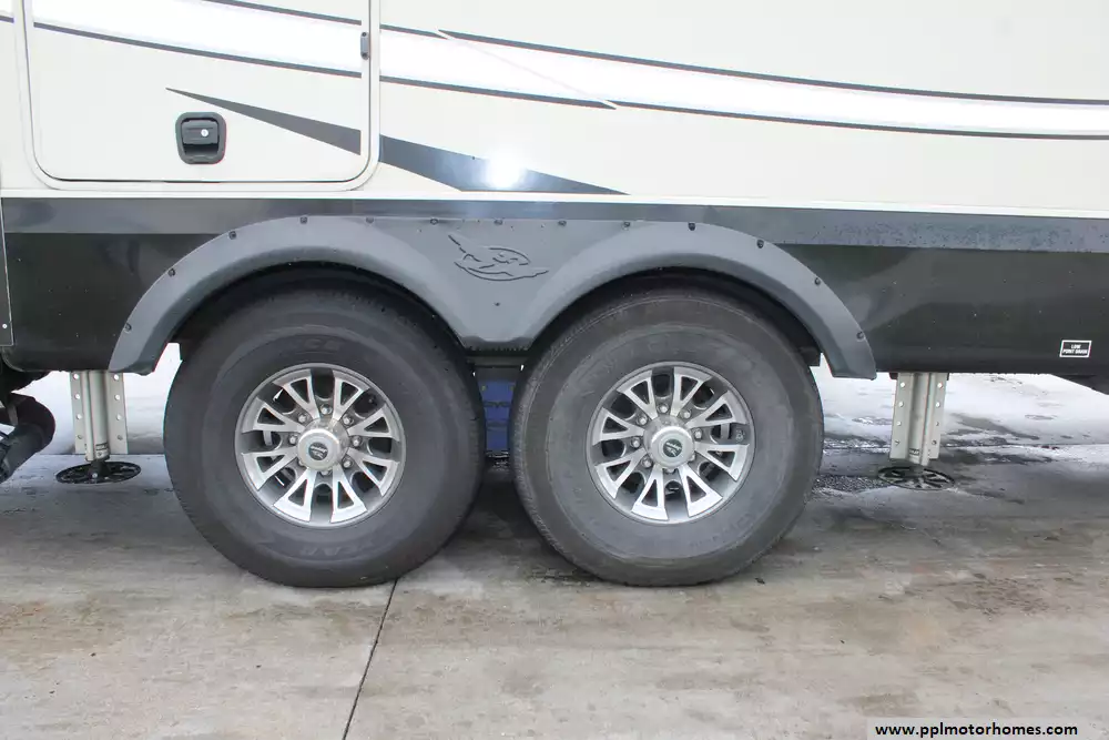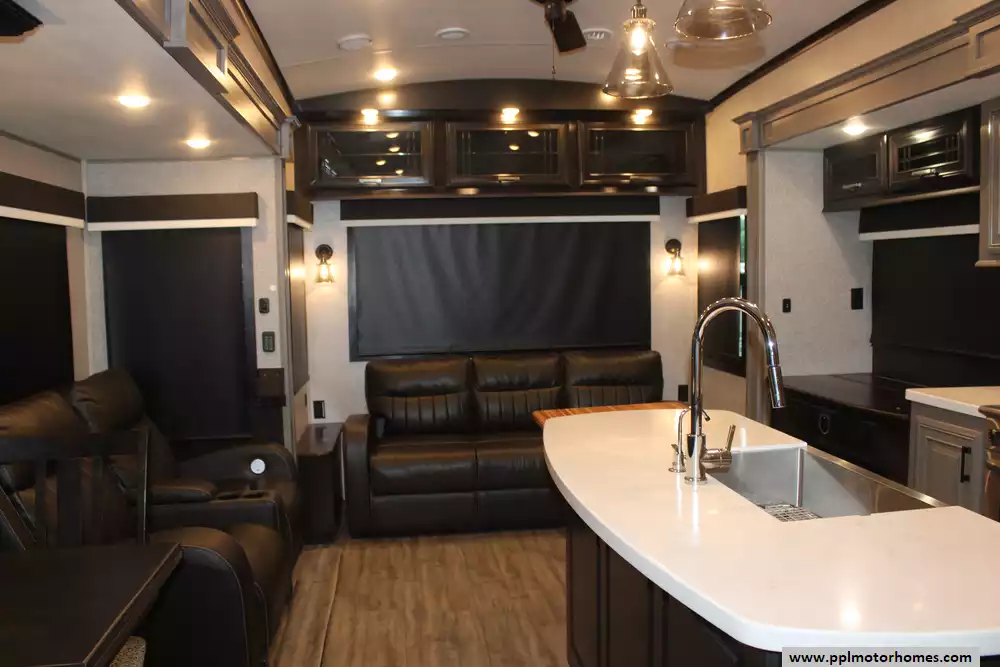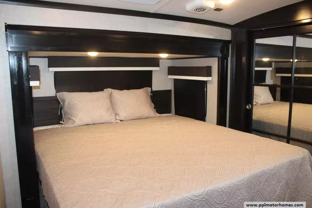 Specs: Length: 36.4 ft., Width: 8.6 ft., Height: 12.8 ft., Interior Height: 8.5 ft., Payload Capacity: 2,690 lbs., Total Fresh Water Tank Capacity: 86 gal., Total Grey Tank Capacity: 87 gal., Total Black Water Tank Capacity: 50 gal.