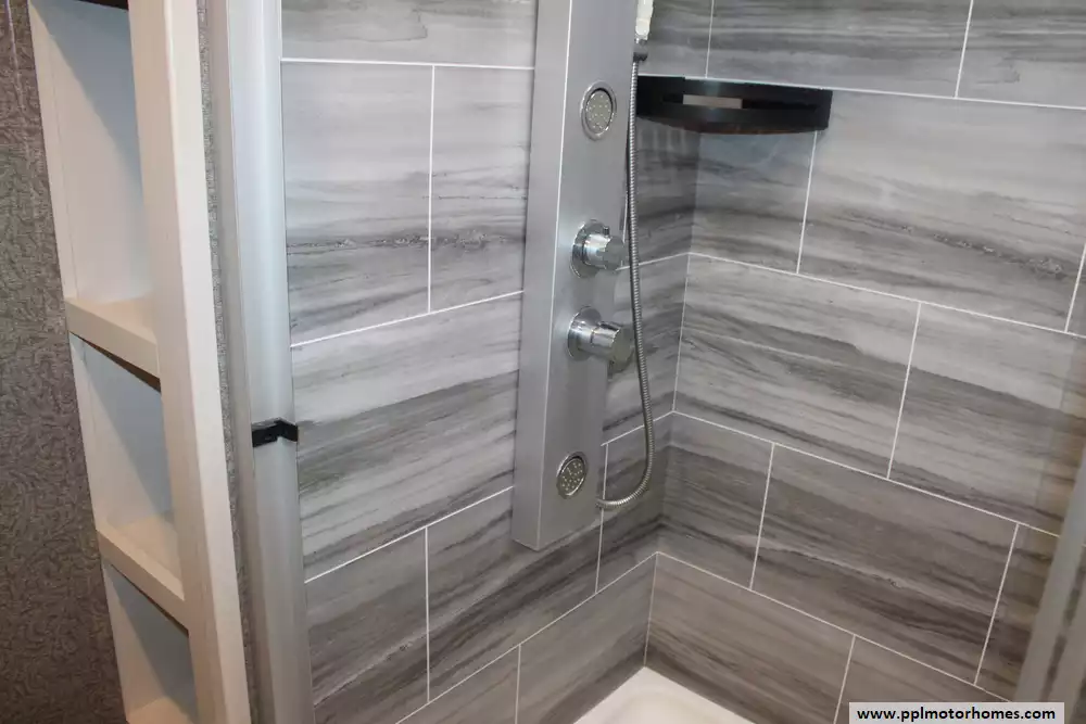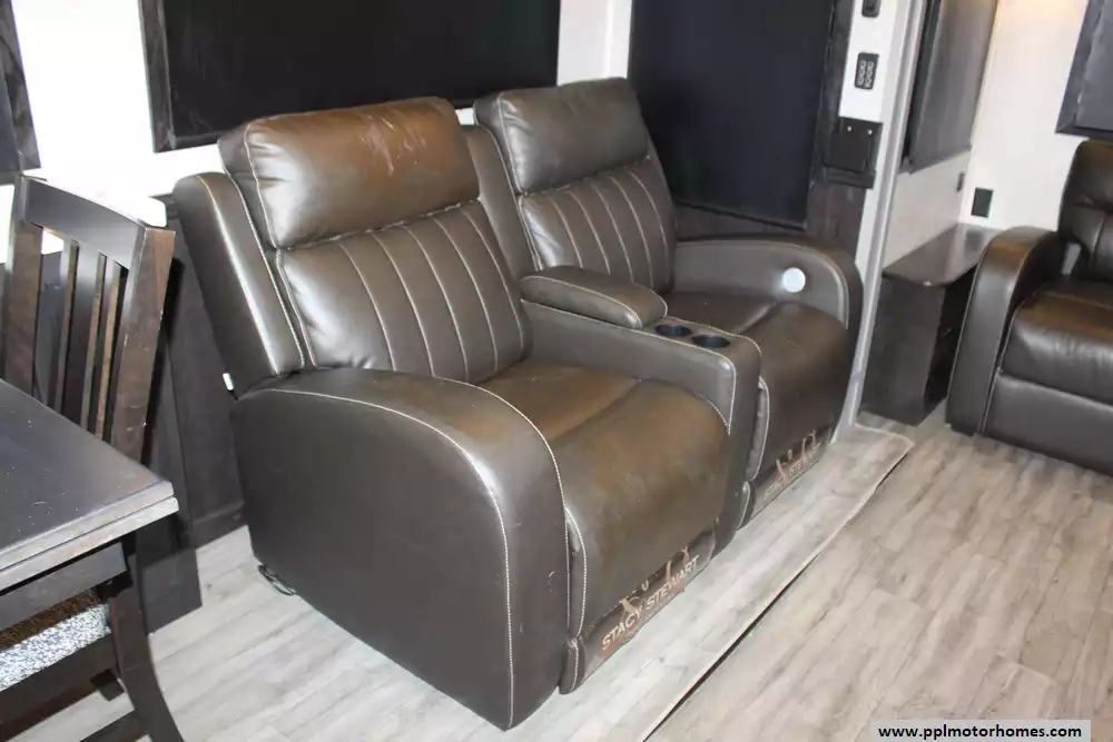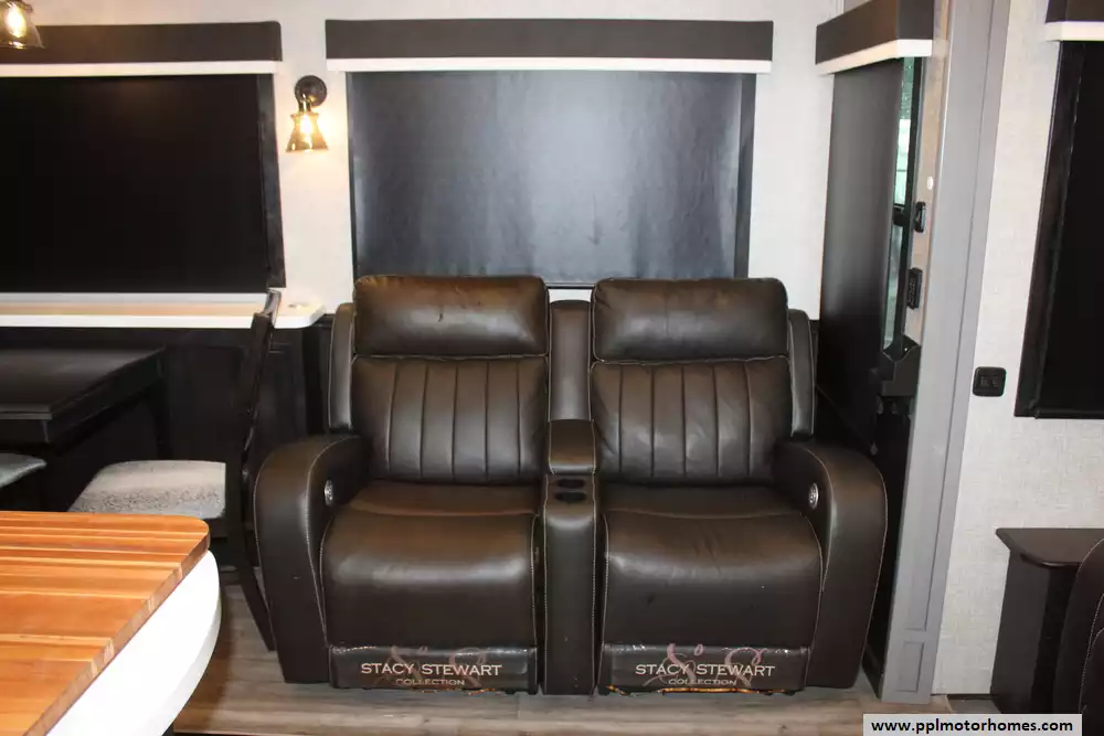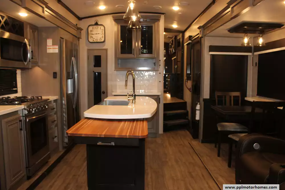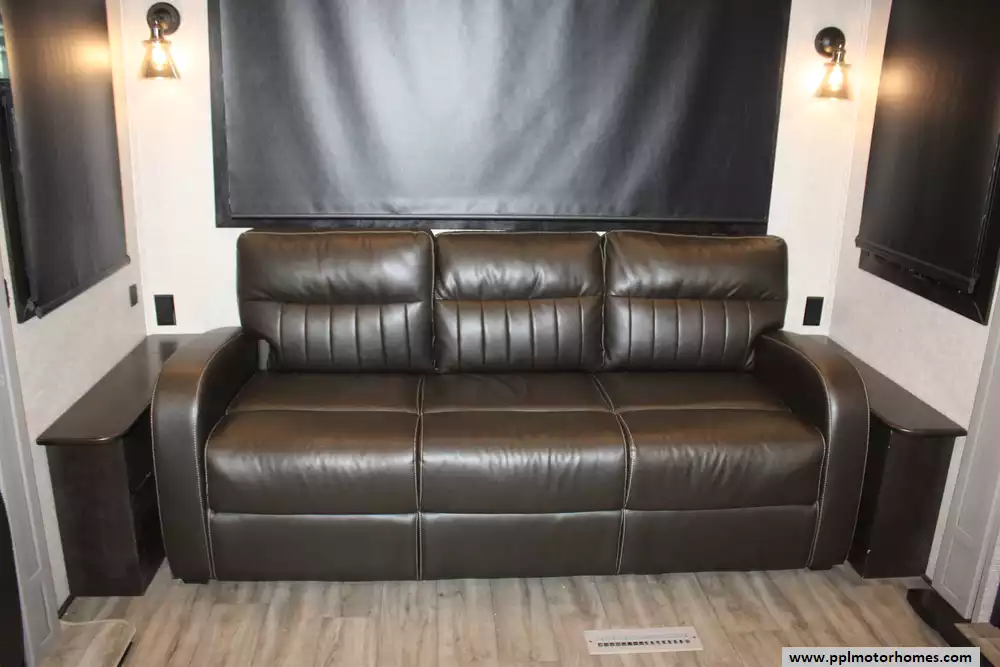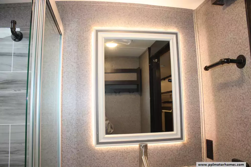 Specs: Length: 36.4 ft., Width: 8.6 ft., Height: 12.8 ft., Interior Height: 8.5 ft., Payload Capacity: 2,690 lbs., Total Fresh Water Tank Capacity: 86 gal., Total Grey Tank Capacity: 87 gal., Total Black Water Tank Capacity: 50 gal.