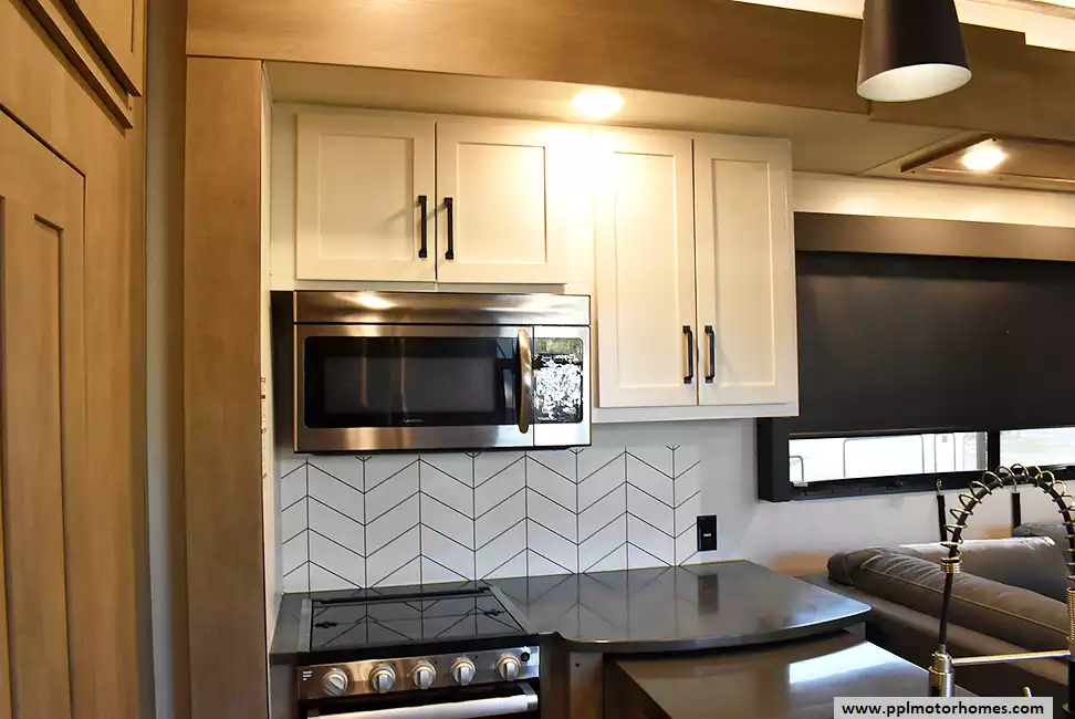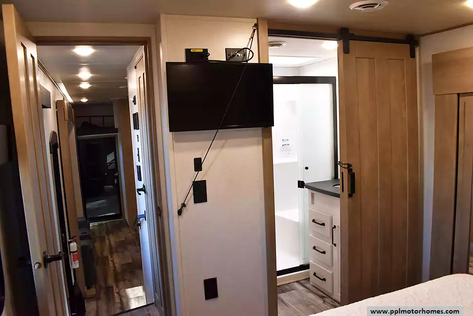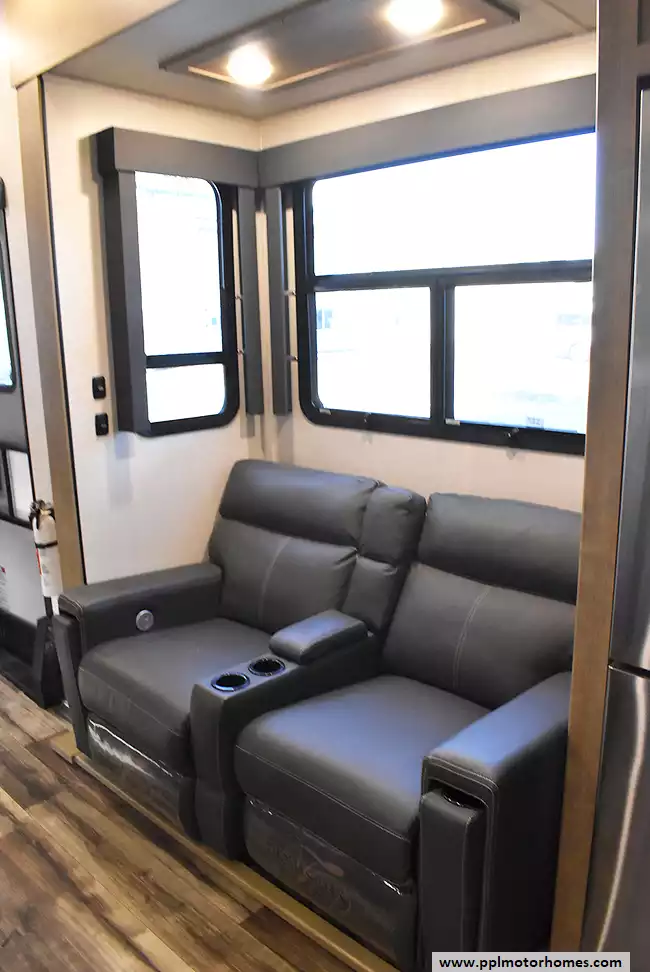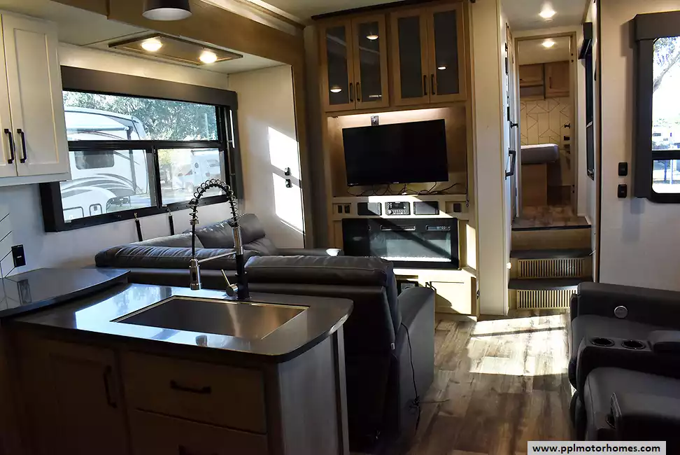 This 2022 Raptor by Keystone 413 has a Hydraulic Landing Gear, 3 Slide-outs, Onan Gas Generator, 3 Ducted Air Conditioners, 4 Door 110v Refrigerator, Automatic Main Awning And Slide Awning, Solar Panel, Heated Tanks, Satellite Receiver, Outside Speakers, 2 TVs, Outside Shower, Fireplace, Convection Microwave, 3 Burner Range, Oven