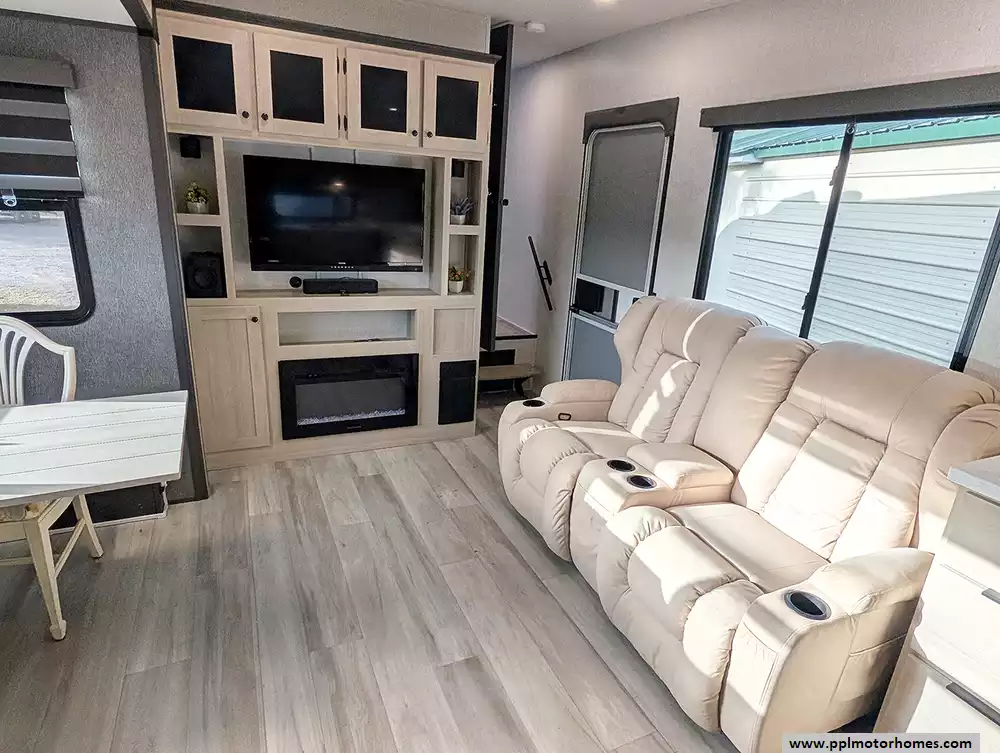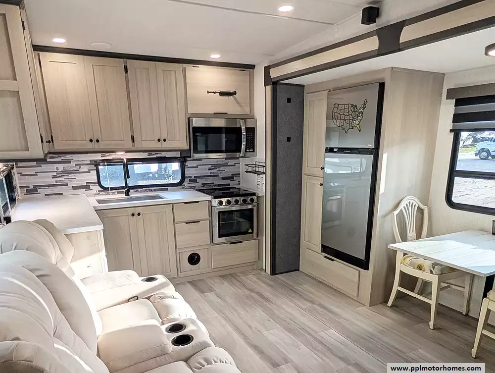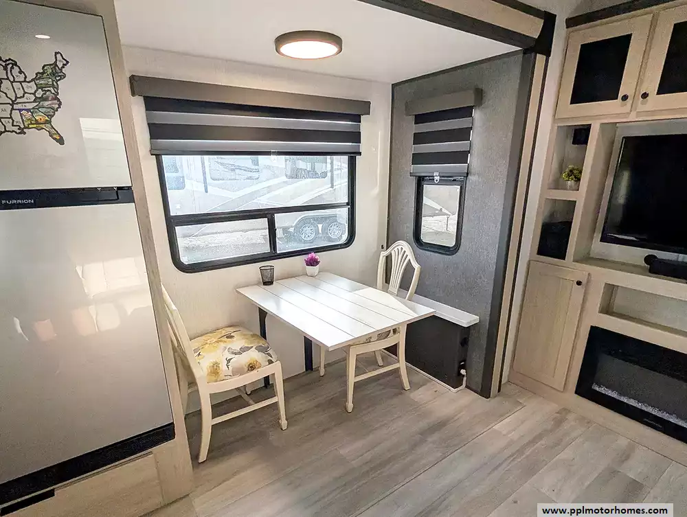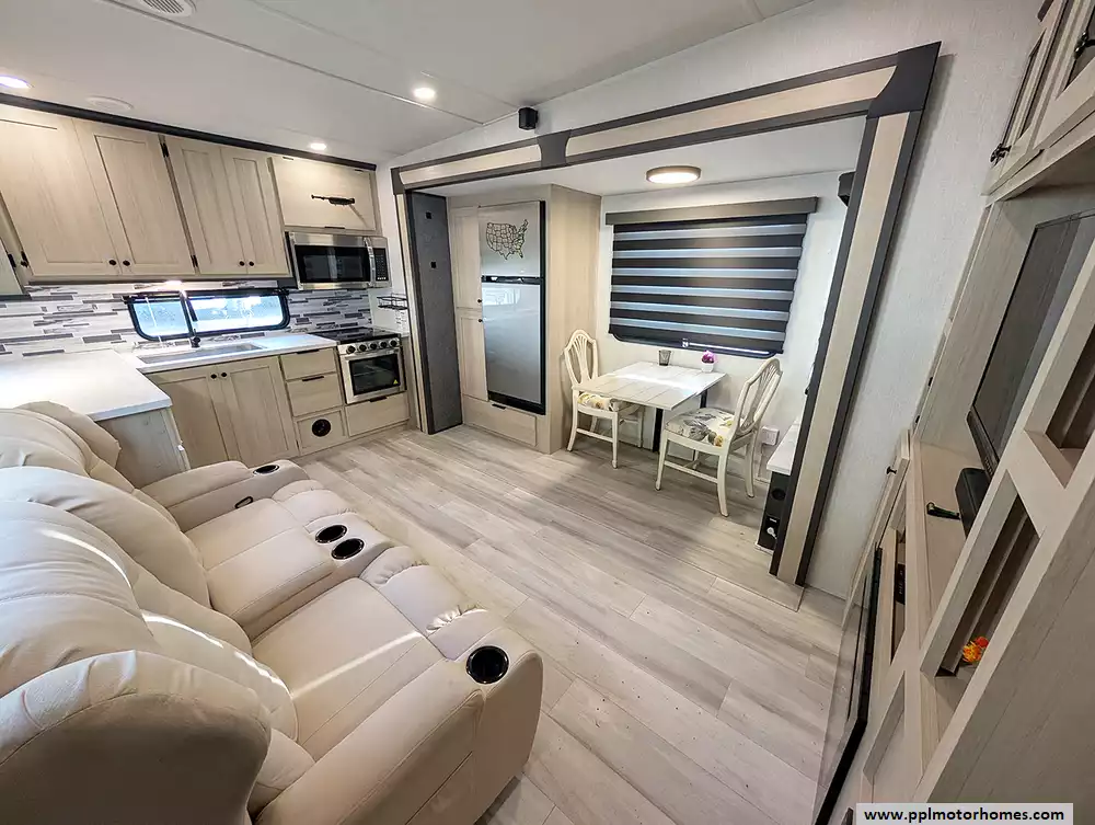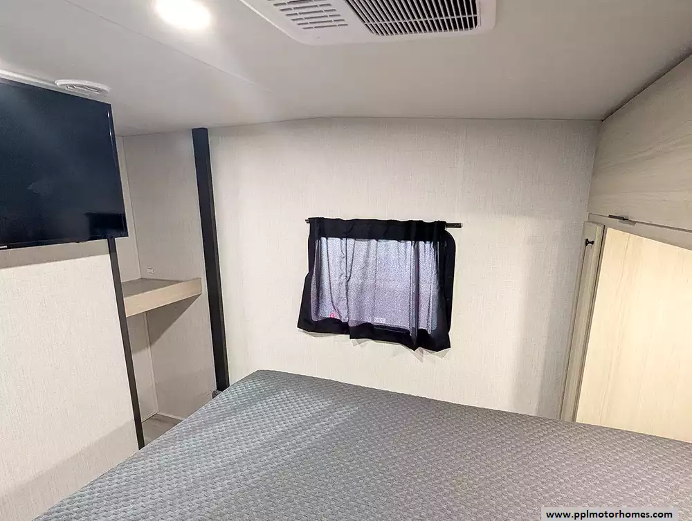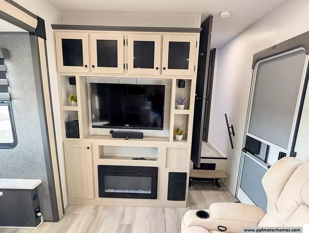 Inside, the single deep slide-out opens up a spacious living area anchored by a cozy fireplace and a modern entertainment suite, including a satellite receiver and two TVs for your viewing pleasure. The rear-kitchen layout provides a residential feel with ample prep space and a suite of high-performance appliances, including a double-door 12v Furrion refrigerator, microwave, three-burner range, and an oven. Combining sophisticated fiberglass styling with a warm, professional finish, the 2025 Wildcat 23RK offers a refined home on the road that is as functional as it is beautiful.