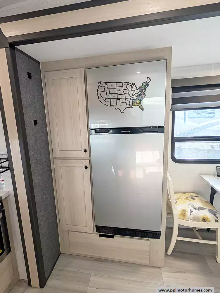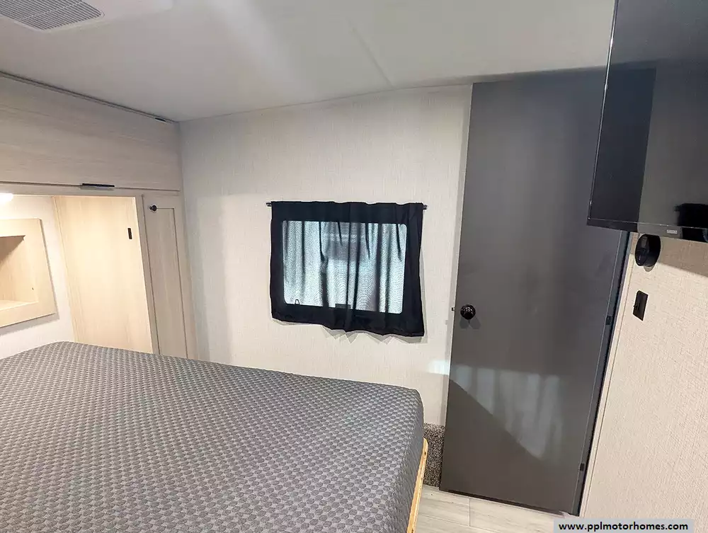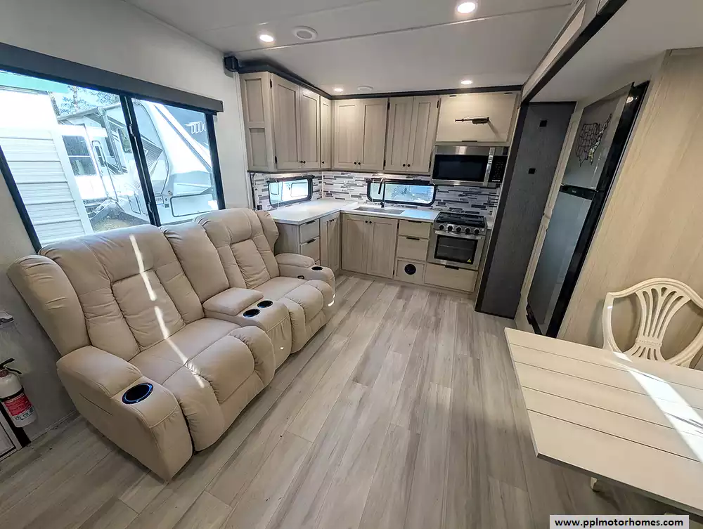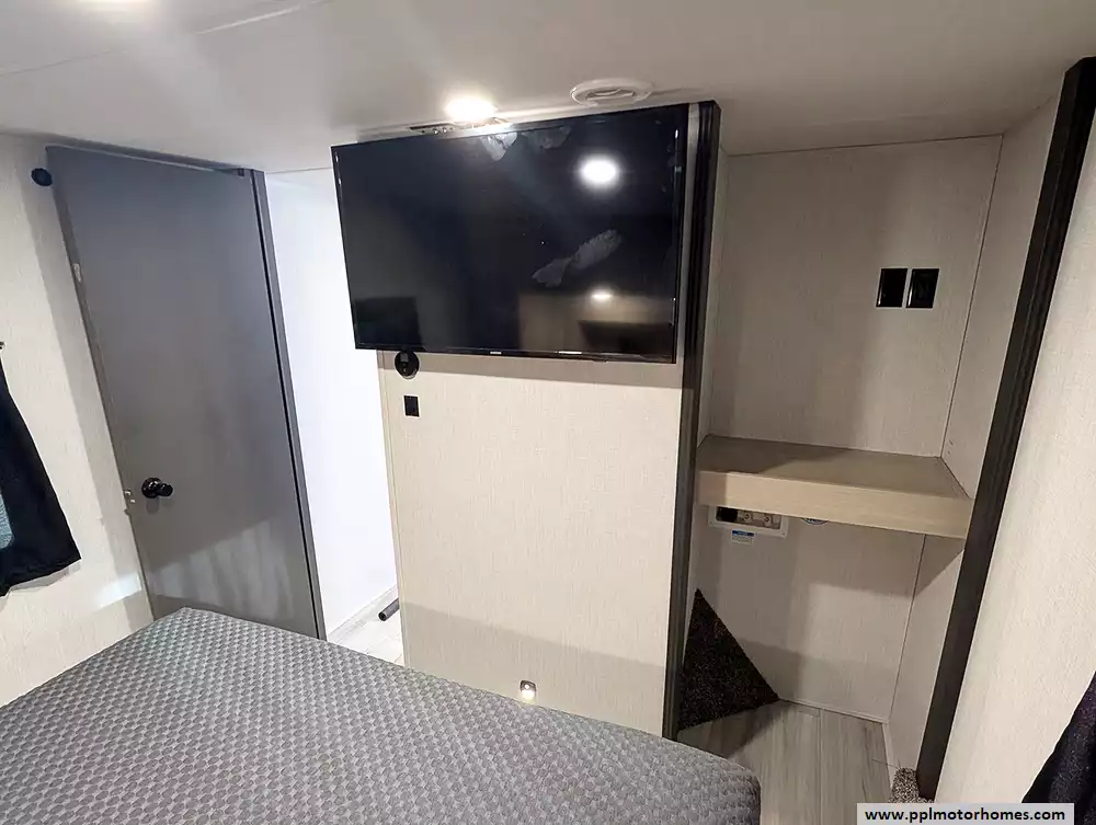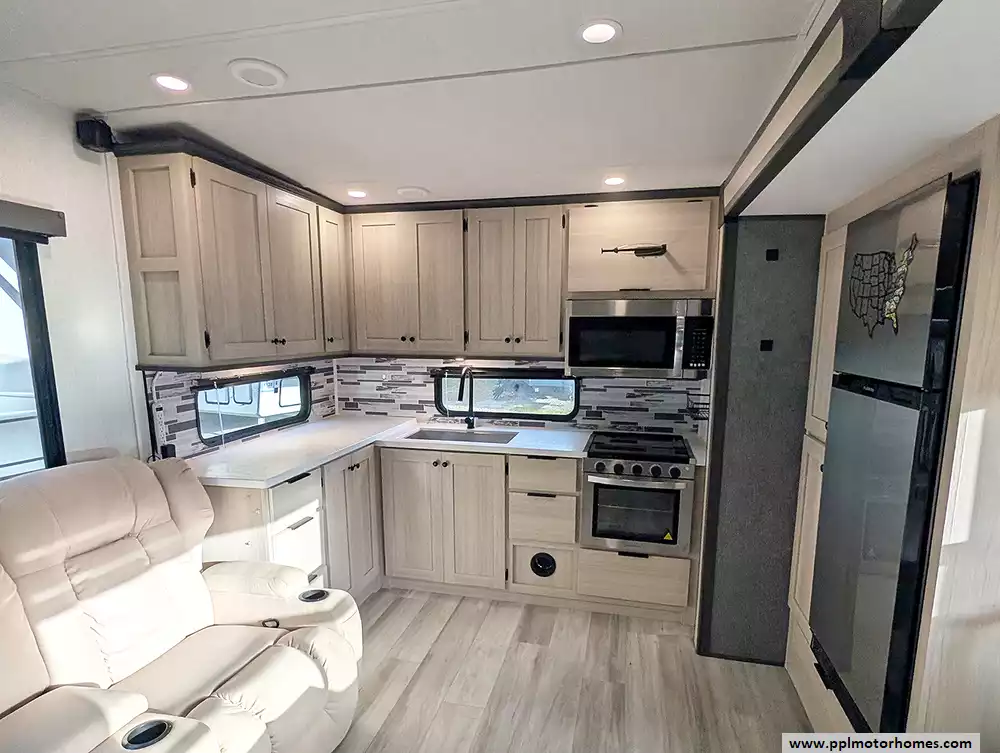Inside, the single deep slide-out opens up a spacious living area anchored by a cozy fireplace and a modern entertainment suite, including a satellite receiver and two TVs for your viewing pleasure. The rear-kitchen layout provides a residential feel with ample prep space and a suite of high-performance appliances, including a double-door 12v Furrion refrigerator, microwave, three-burner range, and an oven. Combining sophisticated fiberglass styling with a warm, professional finish, the 2025 Wildcat 23RK offers a refined home on the road that is as functional as it is beautiful.