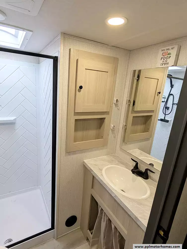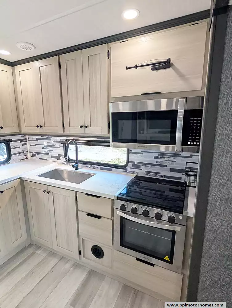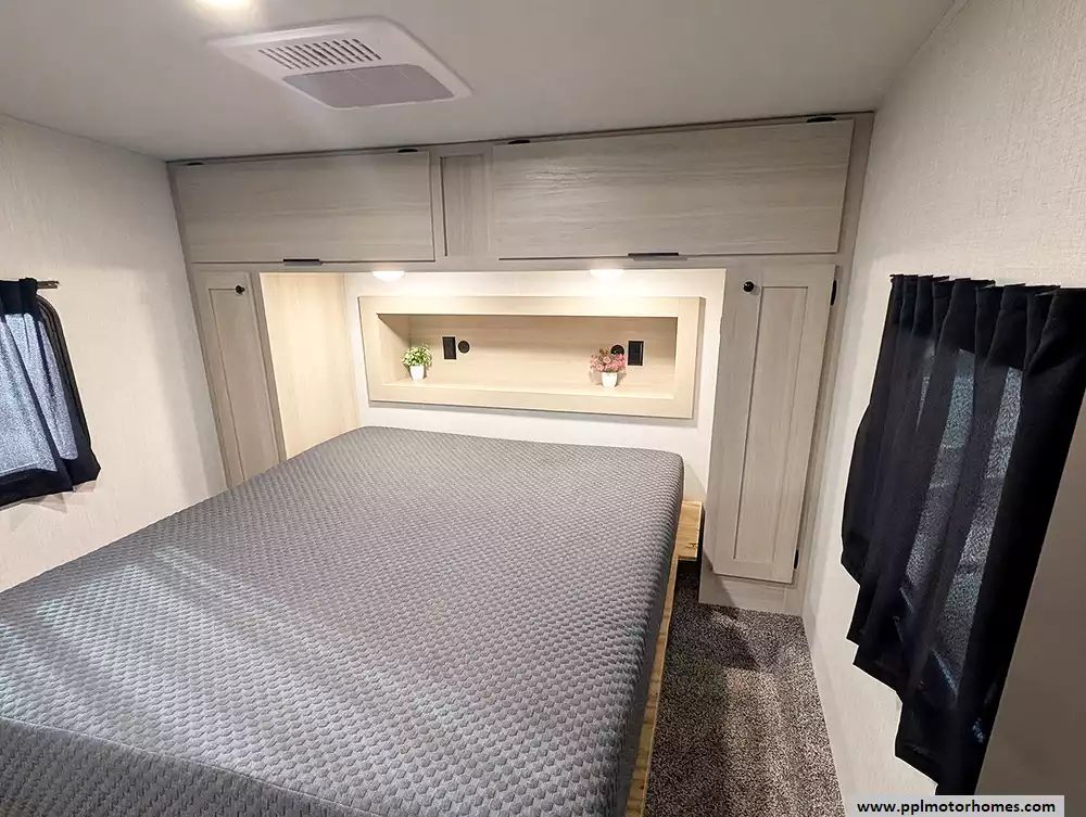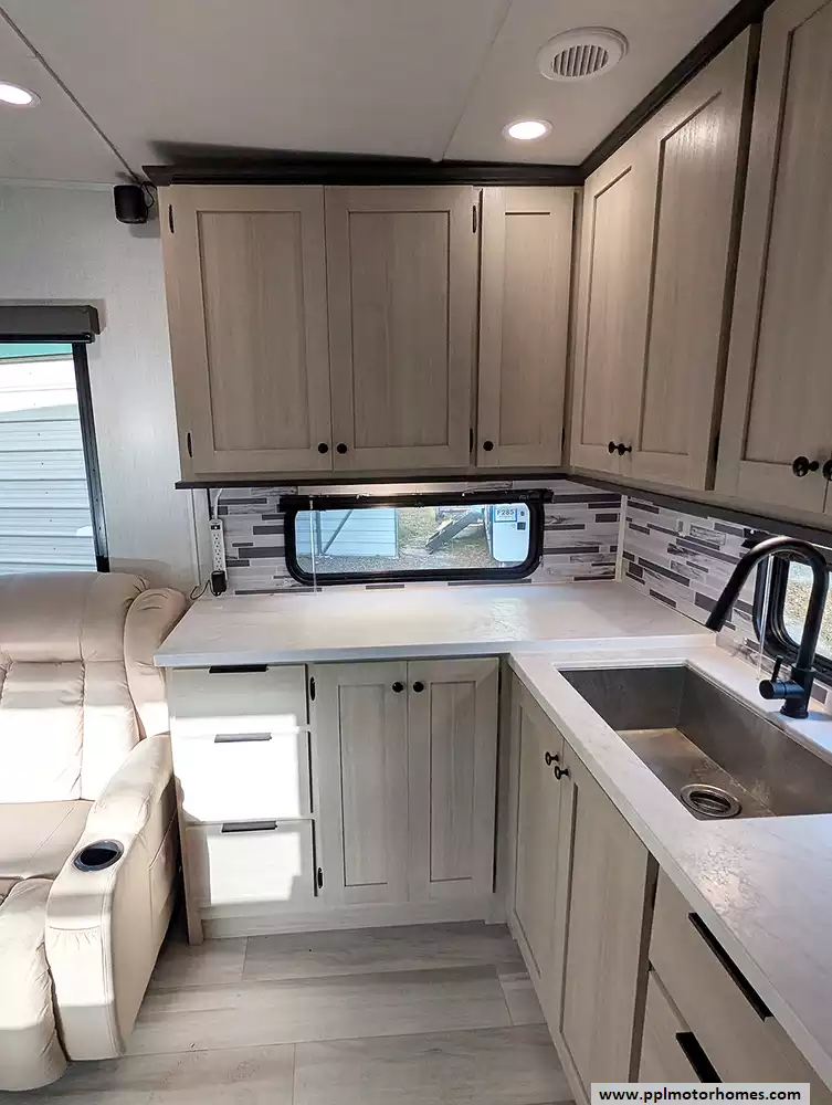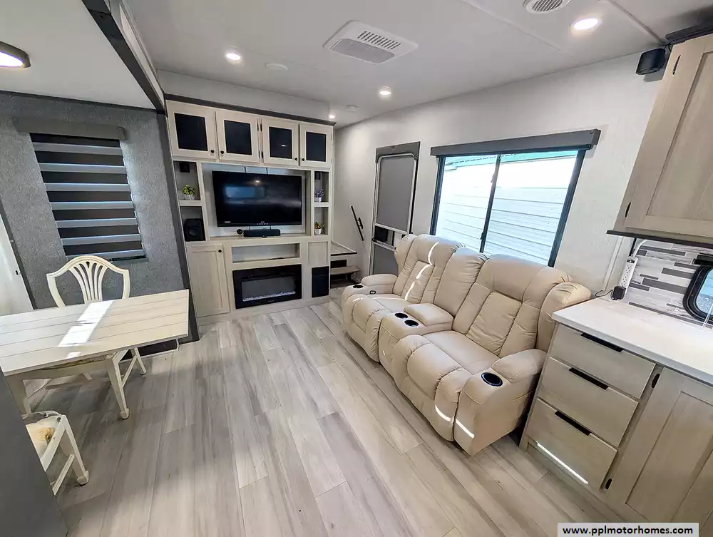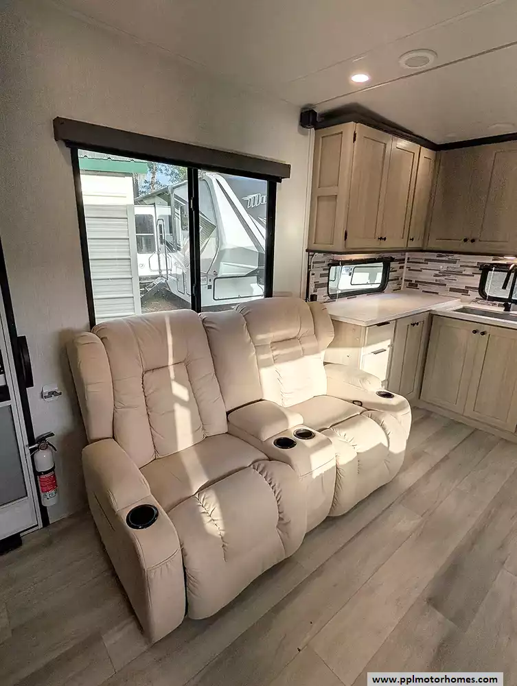 Inside, the single deep slide-out opens up a spacious living area anchored by a cozy fireplace and a modern entertainment suite, including a satellite receiver and two TVs for your viewing pleasure. The rear-kitchen layout provides a residential feel with ample prep space and a suite of high-performance appliances, including a double-door 12v Furrion refrigerator, microwave, three-burner range, and an oven. Combining sophisticated fiberglass styling with a warm, professional finish, the 2025 Wildcat 23RK offers a refined home on the road that is as functional as it is beautiful.