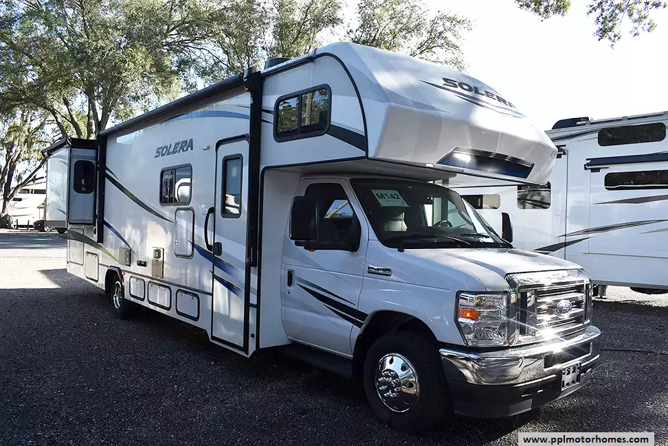 This 2021 Solera 32DSK has a 7.3 L V8 Ford Engine On a Ford 450 Chassis, 2 Slide-outs, Onan Gas Generator, 2 Ducted Air Conditioners, Levelers, Double Door Residential Magic Chef Refrigerator, Automatic Main Awning And Slide Awning, Backup Camera, Solar Panel, Heated Tanks, Outside Speakers, TV, Convection Microwave, 3 Burner Range