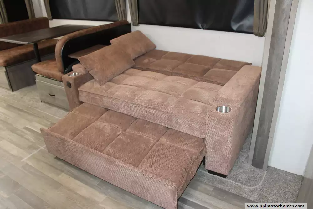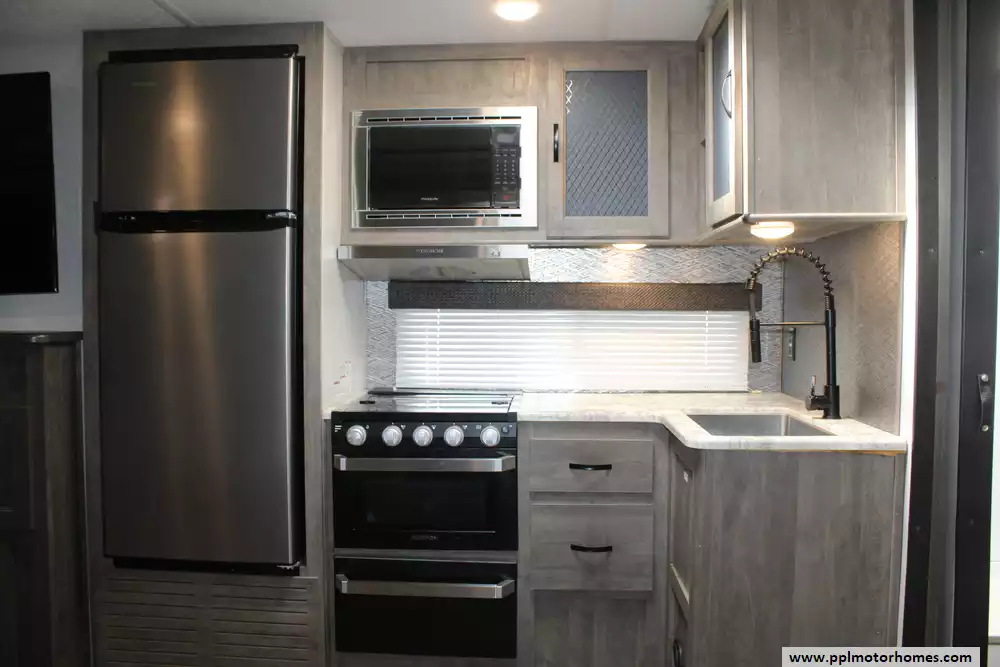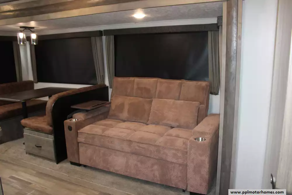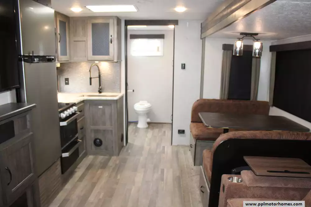 The chef-ready kitchen features a three-burner range, oven, microwave, and a large double-door Everchill refrigerator, making meal preparation a breeze. This model is uniquely prepared for long-term stays with dedicated washer and dryer connections, a rare find in this class. Outdoor living is just as impressive, featuring an automatic main awning, outside speakers for entertainment, and an outside shower for quick clean-ups after a day of adventure. Complete with an electric tongue jack for effortless setup, this Vibe 28RB stands out as a sophisticated choice for travelers who refuse to compromise on convenience or style.