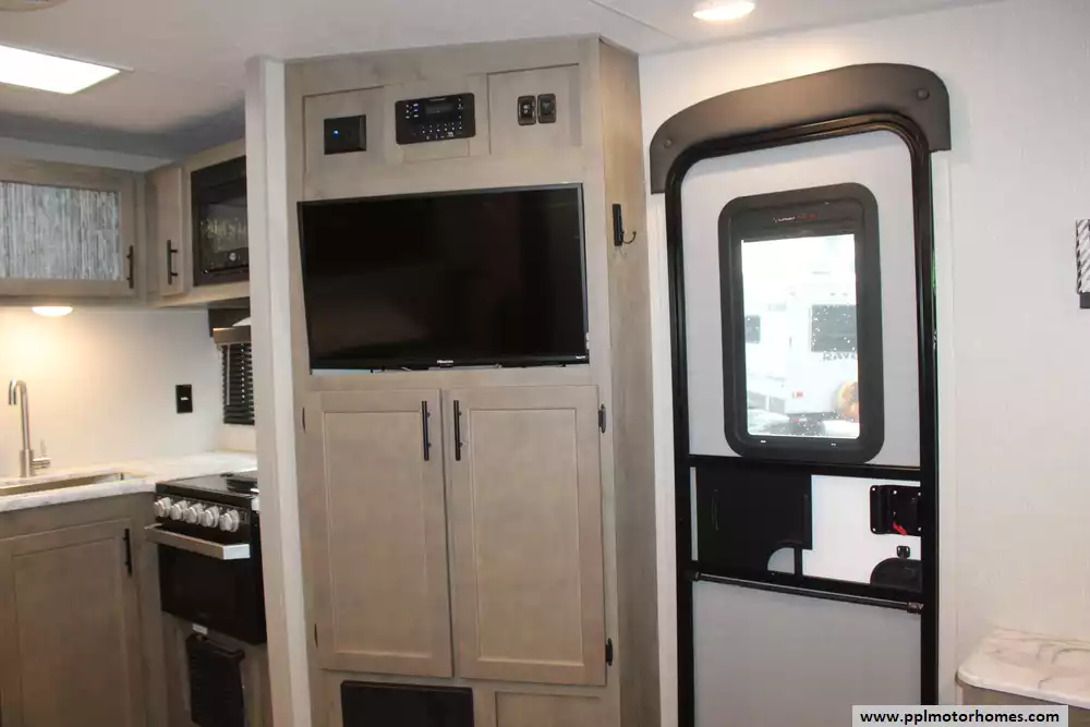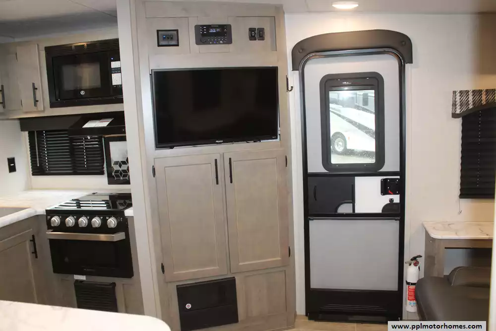 Inside, you will find a warm and inviting atmosphere anchored by a cozy fireplace and a complete entertainment center featuring a TV and DVD player. The galley is fully equipped for any culinary task with a three-burner range, oven, microwave, and a large Norcold double-door gas/110v refrigerator. Outdoor living is just as effortless, thanks to the automatic main awning and outside speakers that create a perfect campsite ambiance. Additional conveniences like the electric tongue jack, outside shower, and sturdy construction ensure that your focus stays on the journey ahead.