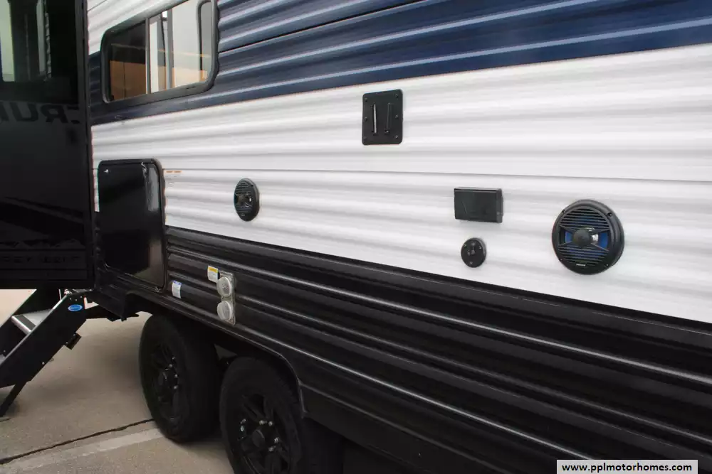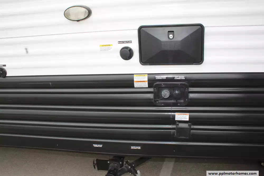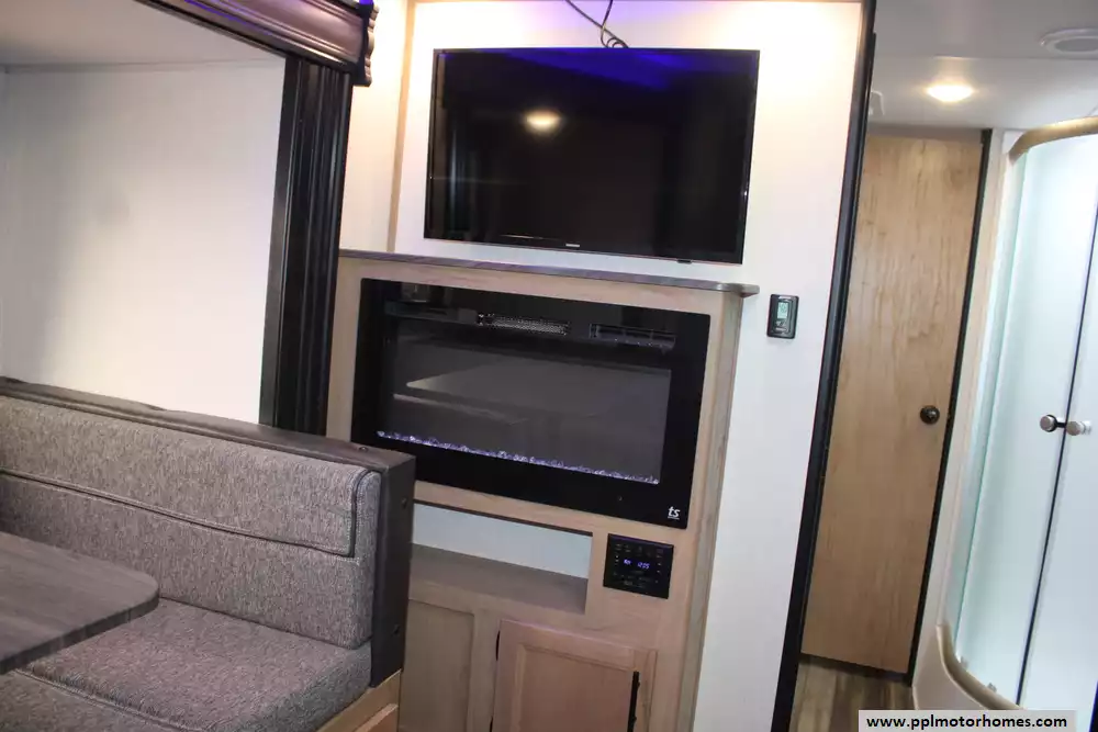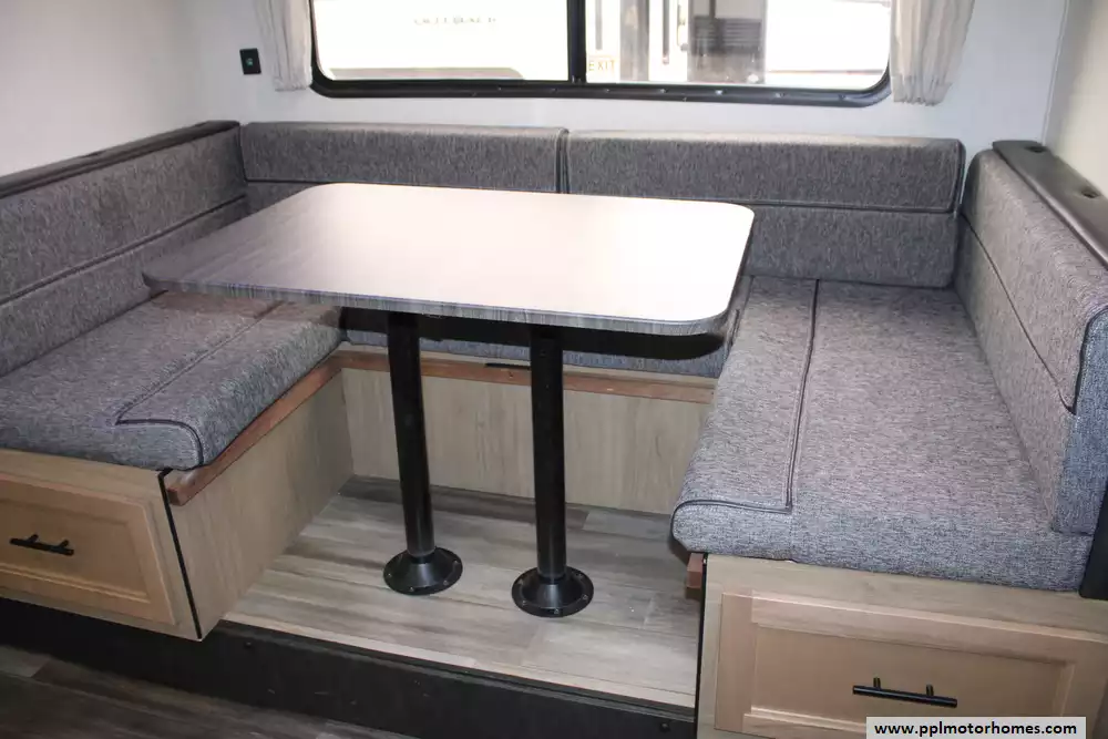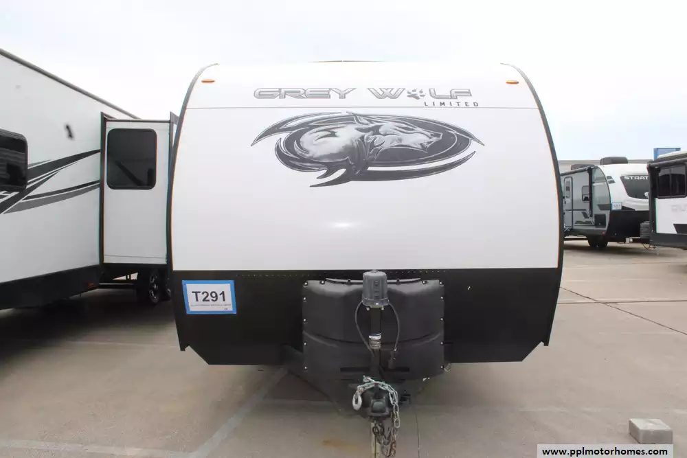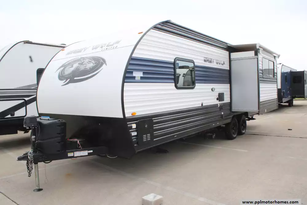 The 2023 Forest River Cherokee Grey Wolf Limited 23MK is a modern travel trailer designed to provide spacious comfort and practical features for couples or small families. Measuring about 29 feet in length with one slide-out and a dry weight of roughly 5,063 pounds, it offers a roomy interior while remaining towable by many half-ton trucks. The rear living area includes a comfortable sofa and a large U-shaped dinette in the slide-out that converts into additional sleeping space, while the private front bedroom features a queen-size bed and storage. The kitchen is well equipped with a three-burner cooktop, microwave, and large 12-volt refrigerator, and the trailer includes a full bathroom with a neo-angled shower. Additional highlights include a 15-foot power awning with LED lighting, exterior storage, and modern amenities such as a 15,000-BTU air conditioner and tankless water heater, making the Grey Wolf 23MK a comfortable and versatile travel trailer for weekend trips or extended camping adventures.
