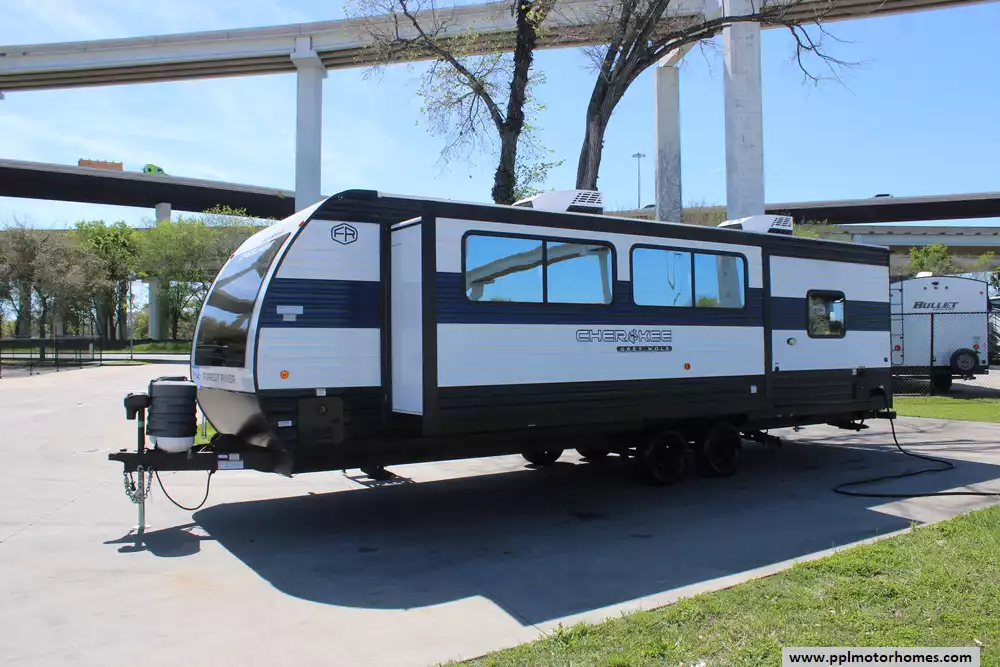 The 2025 Cherokee Grey Wolf 27GH represents the pinnacle of modern camping, blending the Cherokee brand's reputation for luxury and value into a versatile 32-foot travel trailer. Built with a durable fiberglass body and a resilient rubber roof, this model is designed to provide a residential feel while on the move. The Cherokee line is celebrated for its spacious interiors and industry-leading panoramic windows, and this unit maximizes that space with a deep slide-out that transforms the living area. To ensure your comfort regardless of the weather, this trailer is uniquely equipped with two ducted air conditioners, providing powerful and efficient cooling throughout the entire coach.